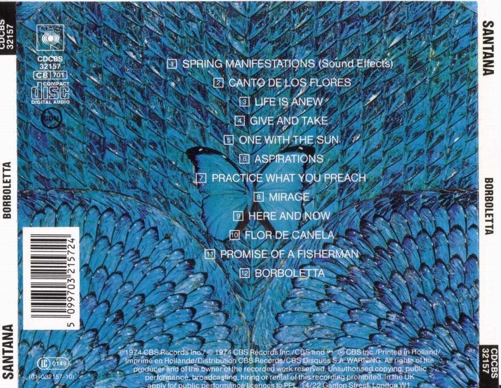 Borboletta was the first new Santana band studio album in 11 months and the group’s sixth overall. Once again, individual credits were listed for each song. The main problem was that the band seemed to be coasting; Carlos turned in the usual complement of high-pitched lead guitar work, and the percussionists pounded away, but the Santana sound had long since taken over from any individual composition, and the records were starting to sound alike. That, in turn, started to make them inessential; Borboletta spent less time on the charts than any previous Santana album.