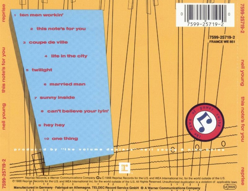 A collective groan from Neil Young fans could be heard when it was announced that, as his return to Reprise Records, Young was engaging in yet another genre experiment, this time recording blues and R&B with a six-piece horn section. If Landing on Water and Life had been lackluster, at least they hadn’t been as embarrassing as Young’s forays into rockabilly (Everybody’s Rockin’) and techno (Trans). And if you took This Note’s for You on its own genre terms, it could be just as laughable. A song like "Sunny Inside," with its marching rhythm and charging horn charts, seemed to demand a forceful, gritty singer on the order of Wilson Pickett, and Young’s watery tenor just didn’t cut it. But the album was only half up-tempo numbers; the other half was bluesy ballads for which Young’s singing was effective and on which he sounded more personally involved than he had in years. And even on the rockers, his sense of humor often carried the day. This Note’s for You was the best of Young’s stylistic side trips because it was the only one in which the style augmented his own instead of overwhelming him. The songs were mediocre, but the playing was spirited. The album earned much better reviews than Young had gotten lately, largely because critics tend to stand in awe of the blues in whatever form it appears. And Young got further kudos due to his contretemps with MTV when the video channel first declined to program a clip for the title song because it featured parodies of popular MTV artists and commercial sponsors, then caved in and named it Best Video of the Year. Lost in all that hoopla, however, was that record buyers never came to the party. This Note’s for You was another commercial failure for Young, and it was apparent that, to lure back his audience, he would have to go back to making the kind of music his fans had liked a decade before.