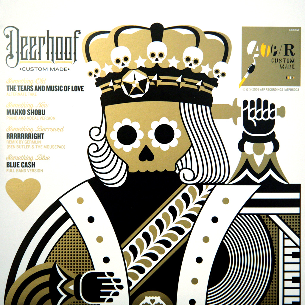 Deerhoof deliver super justice on this lavish double gatefold 7" courtesy of those nice folk at ATP records. ‘Custom Made’ has the theme of ‘something old, something new, something borrowed, something blue’. I don’t know if wedding bells are in the air at camp Deerhoof but the theme gives the group a chance to showcase an alternate mix of ‘The Tears and Music of Love’ (something old..) and reworking of ‘Makka Shobu’ from single ‘Matchbook seeks maniac’ (something new….sort of…), a remix of ‘Rrrrrrright’ by Germlin (a.k.a. Joe Howe of Gay Against you and Ben Butler and the Mousepad (this is something borrowed) and finally a return visit to Apple O’s ‘Blue Cash’ (something blue…you get it) featuring new dude Ed Rodriguez (guitarist and former member of XBXRX among others). ‘The Tears..’ is fresher, livelier and generally better than the album version, Germlin’s kooky remix is totally killer and the reworking of theme to that Robinson’s cordial ad (‘Blue Cash’) really benefits from the rethink and some sweet production work. Also features beautiful artwork by Matt Goldman. If this was in my christmas stocking i’d probably hit myself with joy! Deerhoof are the best band in the world, you should buy all their records….including this one.