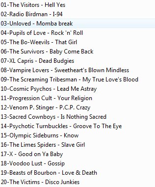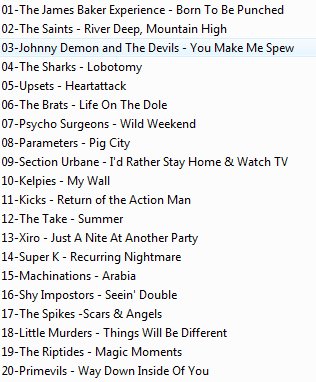 Viker suggested I make a mix for this month and I thought it a good idea. It was no use to try to thin it down to one mix or two, but doing a bunch all at once would make it overwhelming. So I’m going to do three volumes one week apart from eachother. I’ll upload this first one now, and then do one each weekend until the end of the month. Featuring songs on the tracker now, songs that will be on the tracker soon, and some others that couldn’t be uploaded (riaa-unsafe, low bitrate, transcoded, etc.) Most of it you’lll find on the tracker by the end of the month, though. I also did a little work on some files that had low volume or excess noise or silence at the beginning of the tracks (The Sharks “Lobotomy” for example, which still sounds rough, but its at least a little louder).
