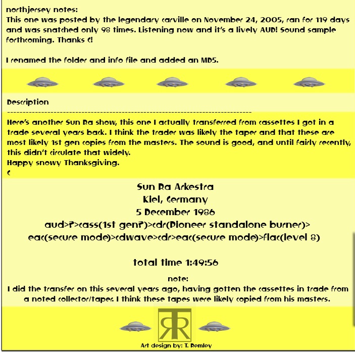 This one was posted by the legendary carville on November 24, 2005, ran for 119 days and was snatched only 98 times. Listening now and it’s a lively AUD! Sound sample forthcoming. Thanks C!