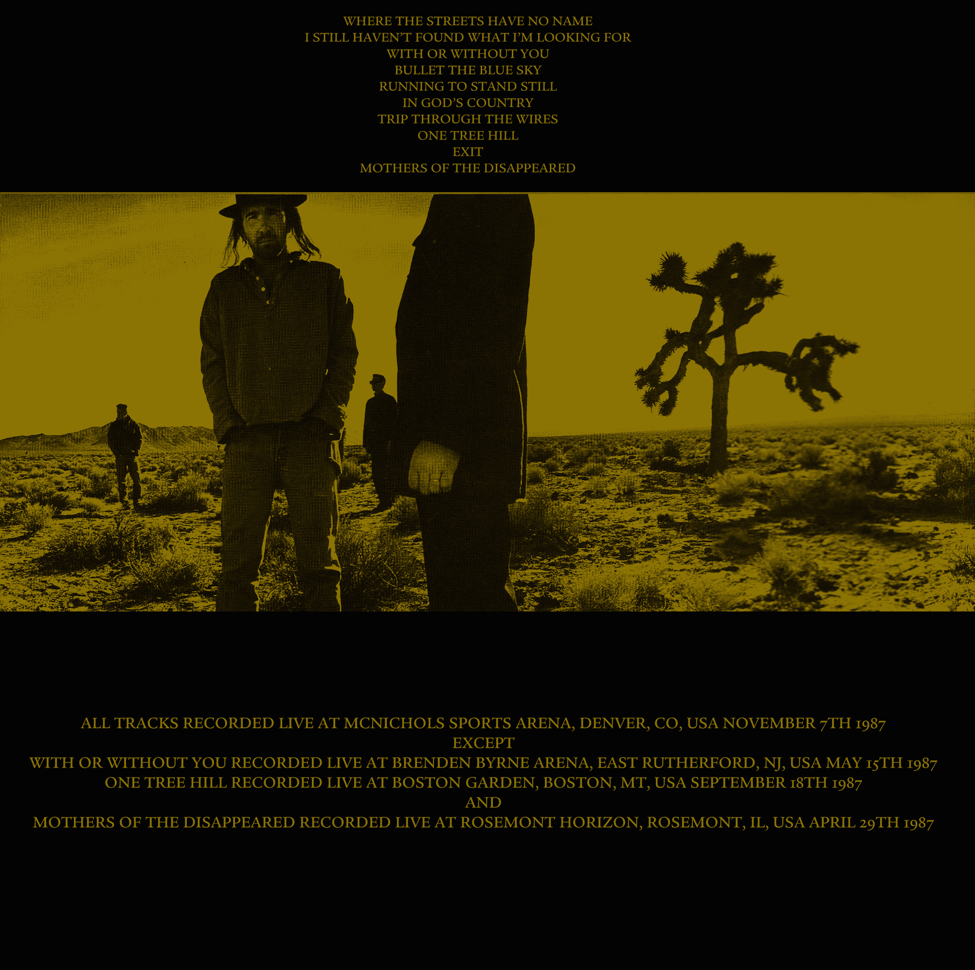 MOTHERS OF THE DISAPPEARED RECORDED LIVE AT ROSEMONT HORIZON, ROSEMONT, IL, USA APRIL 29TH 19875th of the series of the U2’s albums live. Tried to catch the best sources possibles and mixed to look like a single concert, just for fun.