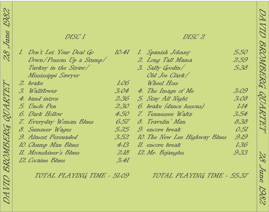 Candleman and I have been sitting on this recording for a few months because it was in the running to be an offical bootleg release. But, after seeing Bromberg last Wednesday and, thanks to Candleman, meeting with him after the show, it’s been decided to post it here instead. I’ve included a CD cover with original photos from the show.