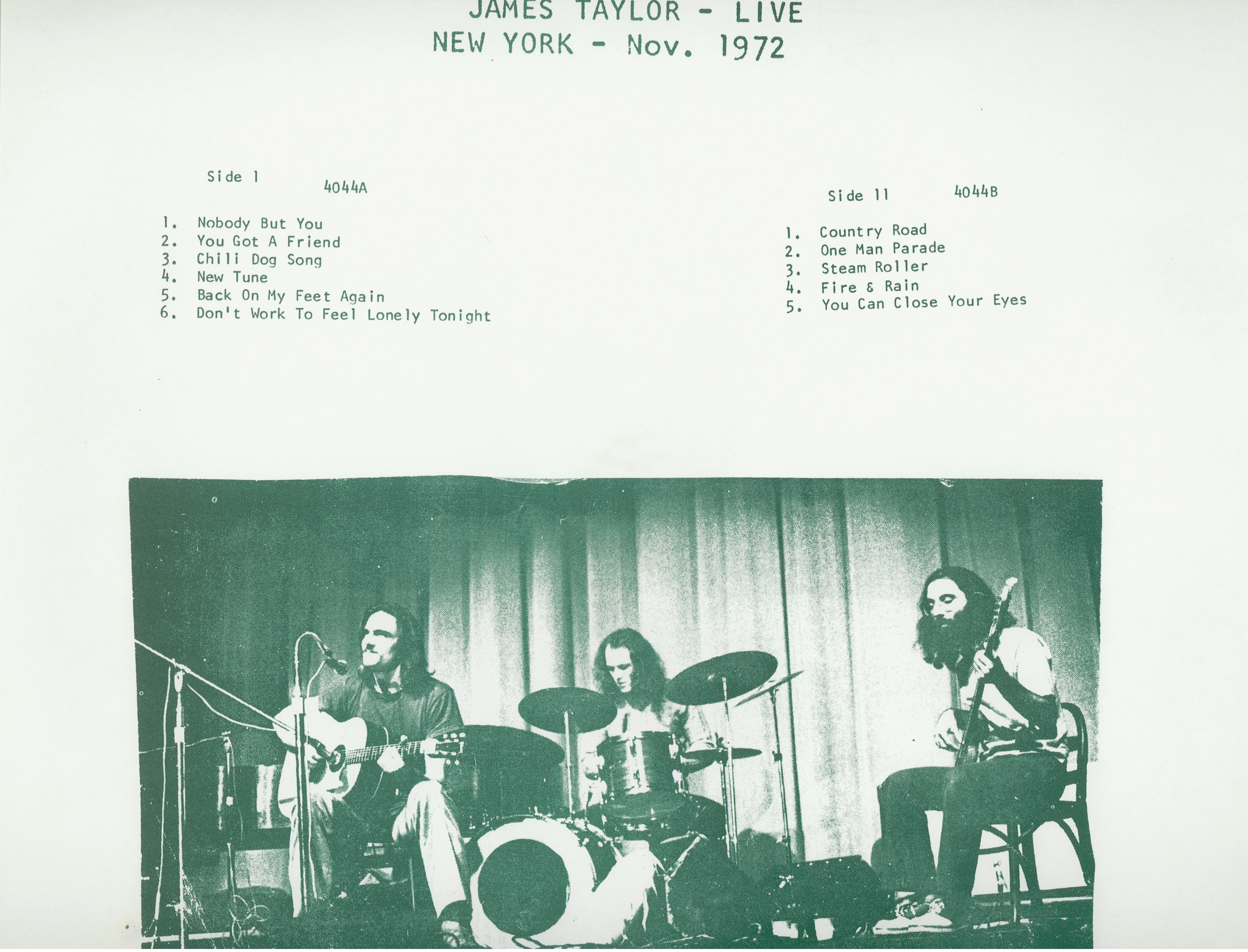 There is a version of this show listed on the James Taylor website, but that one is a double-album budget reissue of two single albums. Are you listening, Mr. Taylor? The album you have here is part two from the original pressing on Country Records. The first volume had “Sweet Records” on the label, and the insert ha a slightly different picture from the one on this album. Neither one of them indicates a first or a second part of the show, just the track listings are different.
