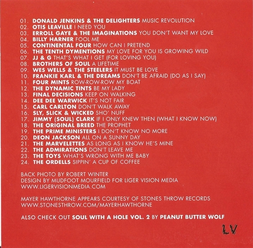 ———————-"As a follow-up to our first installation of Stones Throw’s 45 Mix-CD Series (V.1-2: J.Rocc/PBW ‘Yo! 45s Rap’), we are proud to present the second installment ‘Soul With A Hole’ by Mayer Hawthorne. 24 rare soul nuggets, hand selected & mixed by Mayer Hawthorne." – Stones Throw