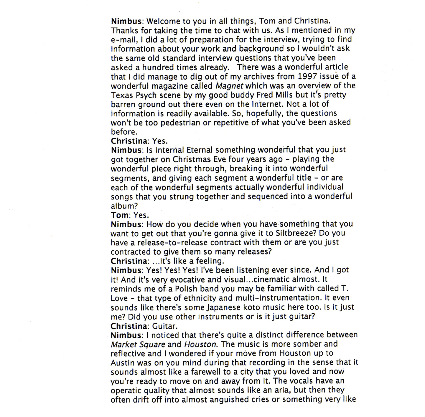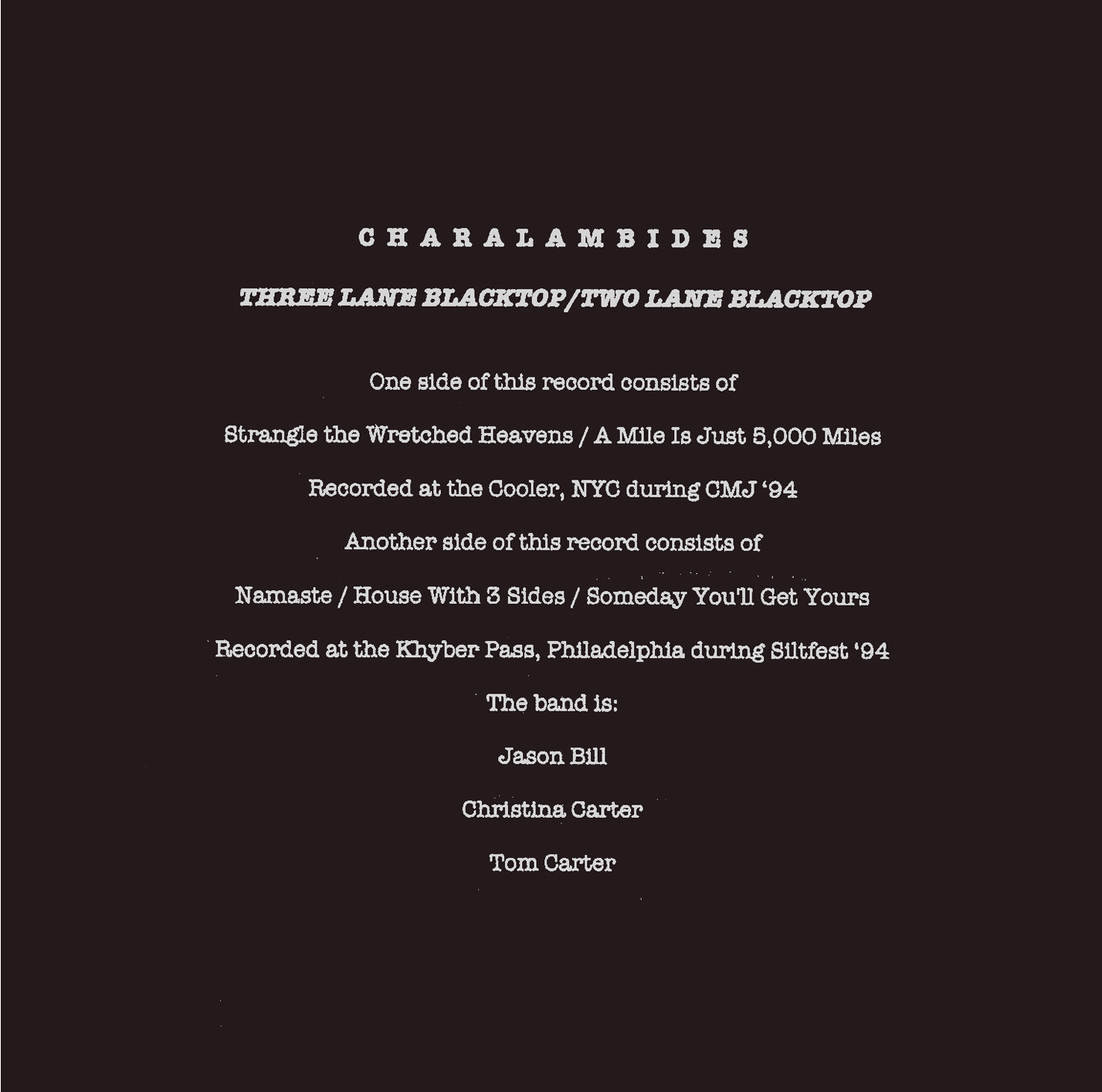“new release of eldritch origin featuring historic recordings of two nearly-complete sets from the “market square”-era charalambides lineup, featuring the core duo of tom & christina carter + jason bill. one side is from the cooler, NYC, at the 1995 CMJ fest (swirling vox sound courtesy kurt wolf), where strapping fieldhands got their fender twin stolen, and bill orcutt & i witnessed the unrepentant use of string-eze by the gtrist from cobra verde. the other side is from the 1994 siltbreeze festival at the khyber pass in philly. both sets consist of freak-rock tracks from “market square” & “strangle the wretched heavens,” heavy on analog atmosphere & ecstatic/blown-out gtr/vox interconnectivity.” – Two-Lane Blacktop