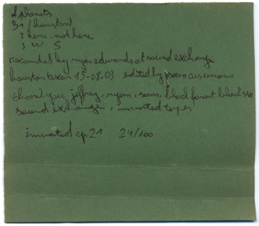 Side B is more personal and intimate. Alone-in-the-dark mantras from the subconscious. “(Houston)” is hushed and broods over the same notes, with soft vocals. A passionate version of “Here Nothere” then emerges out of a disparate chord pattern. (Carter’s music would not be so forceful as to pull something pre-defined like a song out of thin air; it must emerge naturally out of something else.) Underneath the sung words, guitar bubbles away like lava.