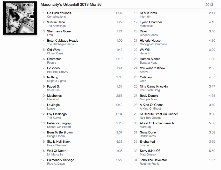 Banana Head / Goodgrief Commune / Screature / Dahga Bloom / Infernöh / Henry H. / Xwave / Red Red Krovvy / Moonrises / The Kurws / The Ukiah Drag / Massicot / Complications / The Cabbage Heads / Noir Boy George / Ride At Dawn / School Girl Report / Barbiturates / Tender Bones / Mr Marcaille / Multiple Man / A Kind Of Ghost / Has a Shadow / Gran / Sulphur Lights / Ragtime Frank / Marburg / Lausen / The Kremlings / Closet Case / Matt Gleeson / Loomer / People / Frau