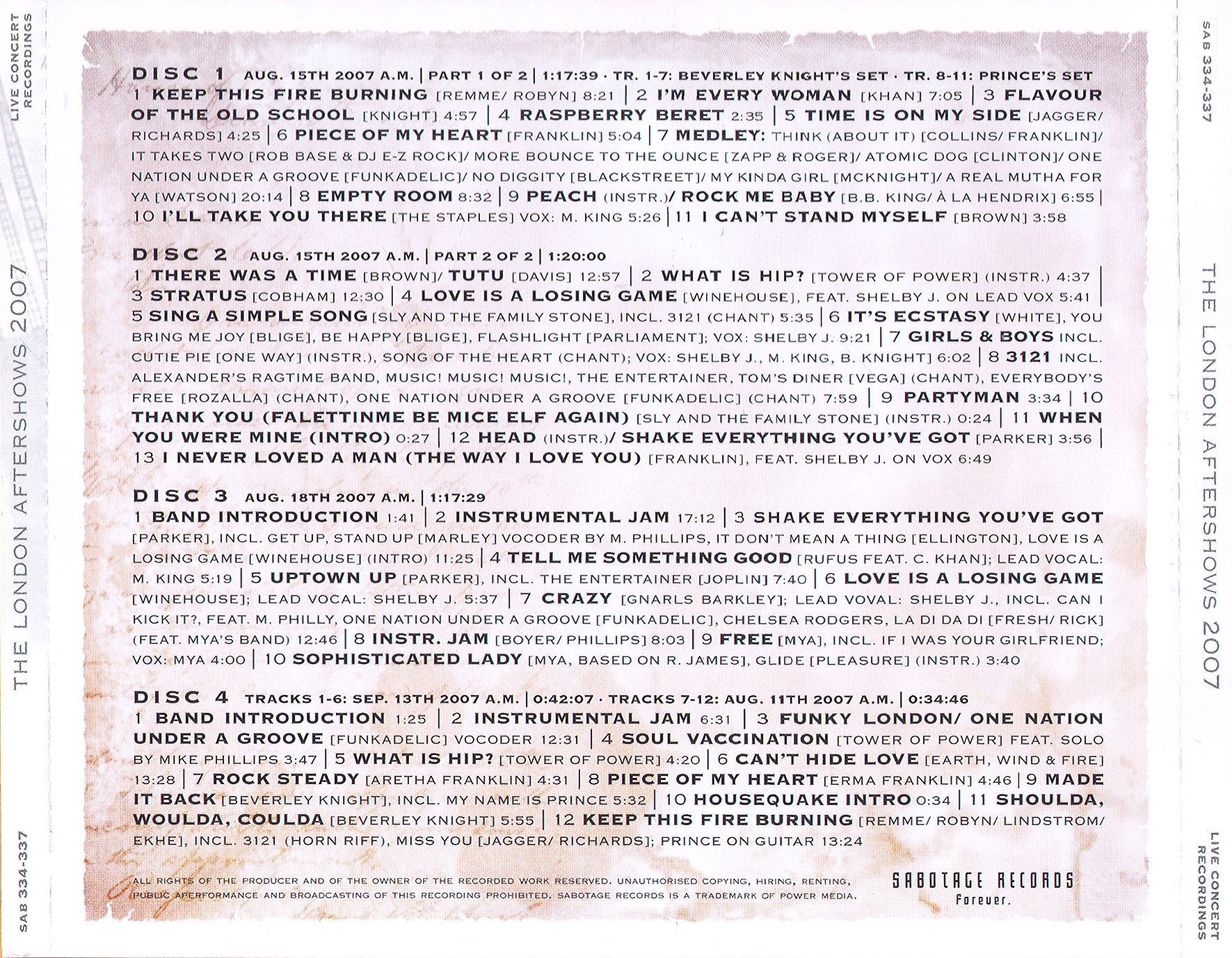 1. Keep This Fire Burning 2. I’m Every Woman 3. Flavour Of The Old School 4. Raspberry Beret 5. Time Is On My Side 6. Piece Of My Heart 7. Think – It Takes Two – More Bounce To The Ounce – Atomic Dog – One Nation Under A Groove – No Diggity – My Kinda Girl – A Real Mutha For Ya