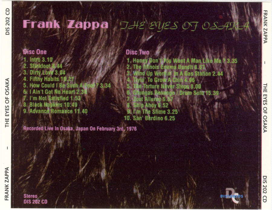 (On Zoot Allures, the 00:00-01:14 and 02:06-07:11 parts of “Black Napkins” have been edited out. The Shut Up & Play Yer Guitar version of “Ship Ahoy” consists of 00:00-04:25 + 04:44-05:41 of the Osaka recording. “Duck Duck Goose” on Läther contains 03:13-04:07 + 04:17-04:23 + 04:44-05:41 of the Osaka recording. At 05:41, the solo is over, and the rest of the track is a band introduction and vamp.)