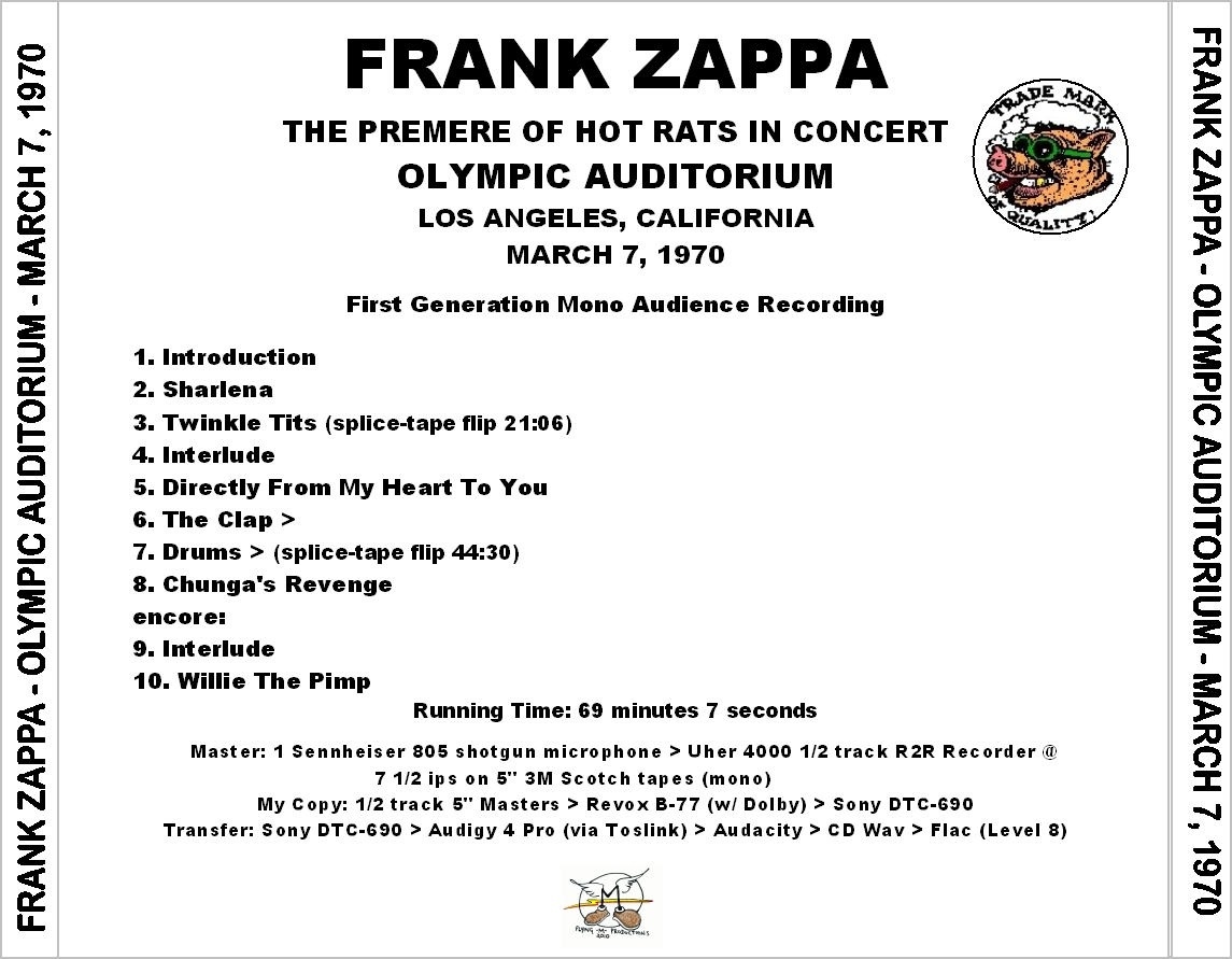 Lineage: AUD MASTER REEL > REEL > REEL > M-AUDIO TRANSIT > WAV > CDR >EAC > WAVE > CD WAVE EDITOR > TRADERS LITTLE HELPER > FLAC