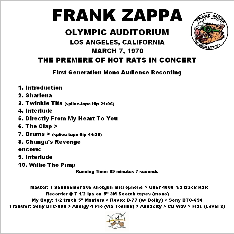 Lineage: AUD MASTER REEL > REEL > REEL > M-AUDIO TRANSIT > WAV > CDR >EAC > WAVE > CD WAVE EDITOR > TRADERS LITTLE HELPER > FLAC