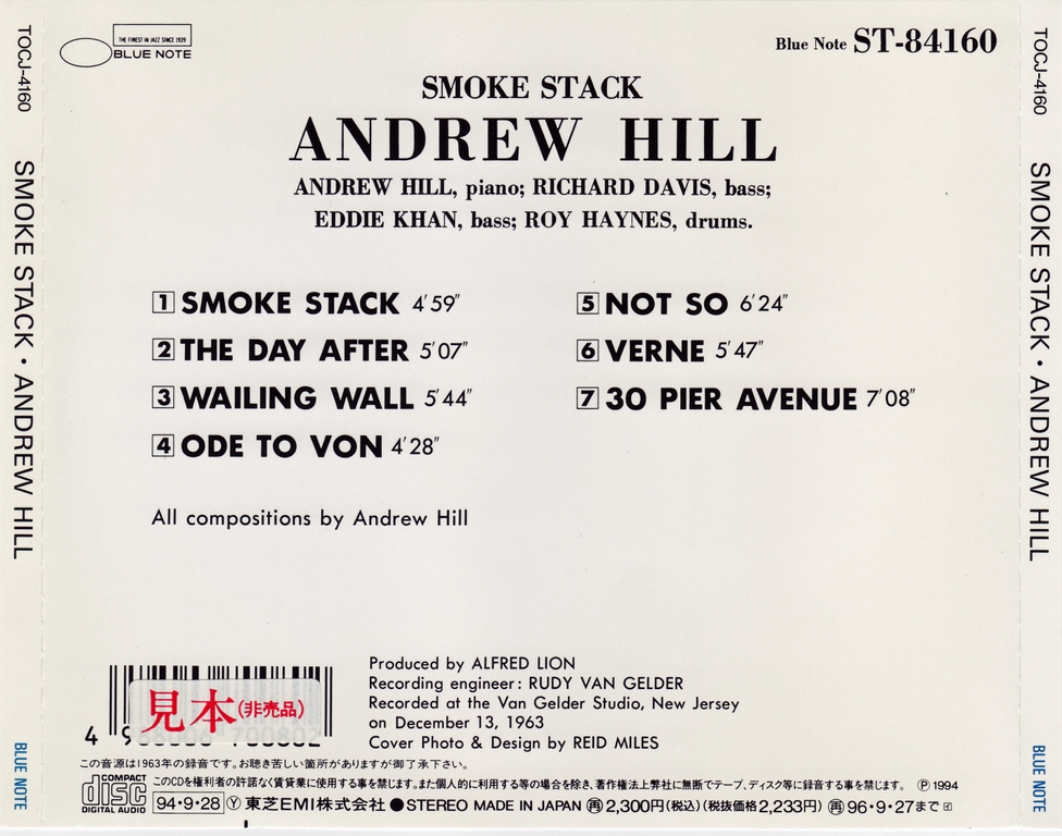 Trimming away some of the overt Afro-Cuban rhythms that distinguished Black Fire, Andrew Hill turned in a dense, cerebral set of adventurous post-bop on his second Blue Note session, Smoke Stack. Comprised entirely of original Hill compositions, Smoke Stack is in the middle ground between hard bop and free jazz — it isn’t as loose and dissonant as free, but with its long, winding modal improvisations and hazy song structures, it’s a lot less accessible than bop. It also isn’t as successful as Black Fire, which worked similar territory with edgier results. Part of the problem is that Hill simply meanders throughout most of Smoke Stack, wandering off into quietly discordant sections that turn in on themselves. It’s subdued music that requires concentration, but doesn’t necessarily reward such effort. Even with its faults, Smoke Stack is far from an unworthy record — Hill’s insular, intellectual style may be occasionally frustrating, but his playing is frequently provocative and challenging, and his backing group of Richard Davis (bass), Eddie Khan (bass), and Roy Haynes (drums) offer sympathetic support. However, it’s an album that promises more than it delivers.