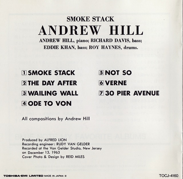 Trimming away some of the overt Afro-Cuban rhythms that distinguished Black Fire, Andrew Hill turned in a dense, cerebral set of adventurous post-bop on his second Blue Note session, Smoke Stack. Comprised entirely of original Hill compositions, Smoke Stack is in the middle ground between hard bop and free jazz — it isn’t as loose and dissonant as free, but with its long, winding modal improvisations and hazy song structures, it’s a lot less accessible than bop. It also isn’t as successful as Black Fire, which worked similar territory with edgier results. Part of the problem is that Hill simply meanders throughout most of Smoke Stack, wandering off into quietly discordant sections that turn in on themselves. It’s subdued music that requires concentration, but doesn’t necessarily reward such effort. Even with its faults, Smoke Stack is far from an unworthy record — Hill’s insular, intellectual style may be occasionally frustrating, but his playing is frequently provocative and challenging, and his backing group of Richard Davis (bass), Eddie Khan (bass), and Roy Haynes (drums) offer sympathetic support. However, it’s an album that promises more than it delivers.