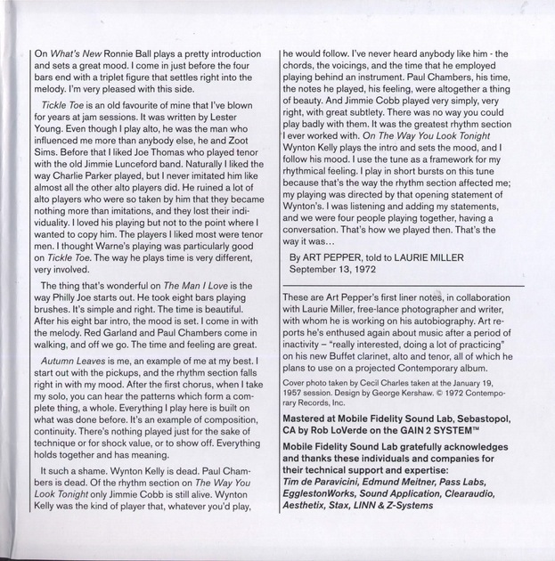 A lavish reissue on SACD from Mo-Fi is always a special thing, and when the music is at such a high level as these early Art Pepper sides, jazz lovers cant lose. Contemporary Records may have been recording in a rather makeshift corner of their warehouse, but they were one of the first record labels to begin recording in two channels, and thus all of these nine tracks some from as early as 1956 two years before the stereodisc was introduced are in two-channel stereo. Pepper himself dictated the liner notes, and theyre printed in actually readable type.