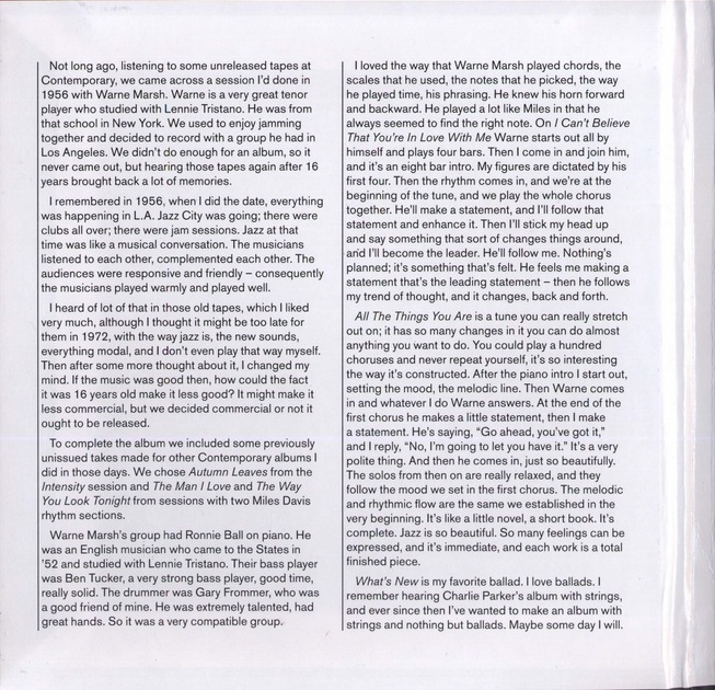 (Art Pepper, alto sax; Warne Marsh, tenor sax; Ronnie Ball, piano; Ben Tucker, bass; Gary Frommer, drums; Red Garland, piano; Paul Chambers, bass; Philly Joe Jones, drums; Dolo Coker, piano; Jimmy Bond, bass; Frank Butler, drums, Wynton Kelly, piano; Jimmy Cobb, drums)