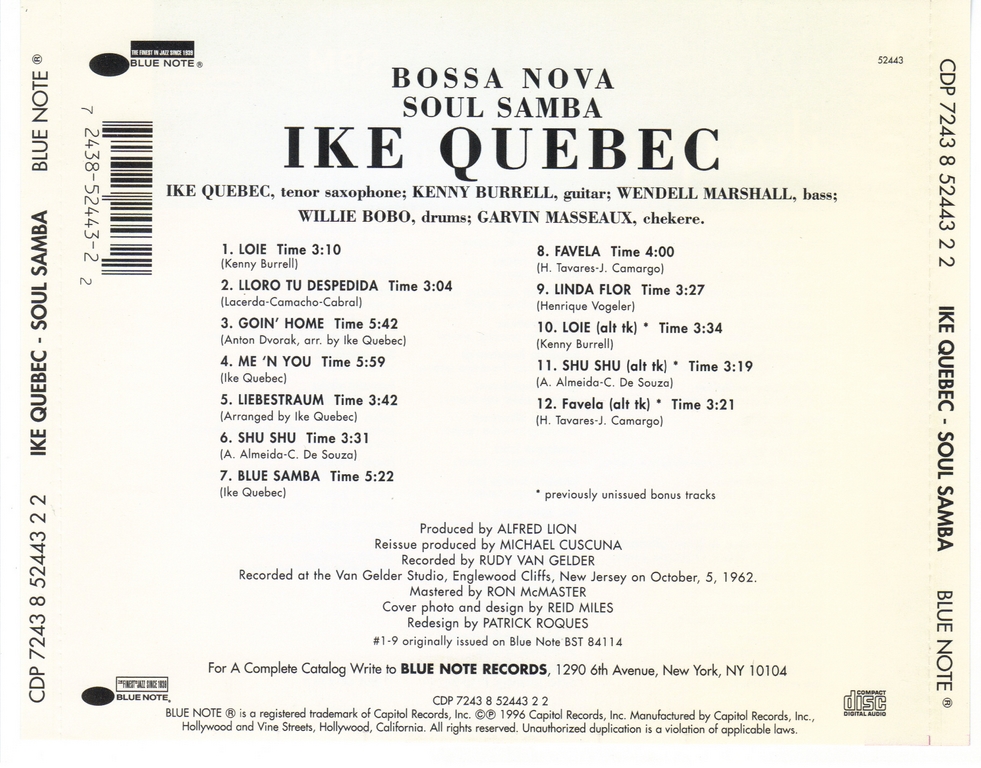 With his thick, engaging sound and elegant romanticism, it only made sense for Ike Quebec to try his hand at the bossa nova boom Stan Getz kick-started in 1962, and that’s what he did with Soul Samba. However, Quebec makes the session much more than mere bandwagon-jumping. He takes some chances with the repertoire and consciously adds a heavy blues inflection that makes Soul Samba one of the more unique interpretations of the bossa nova style. It’s also one of the more sensuous, thanks in part to the combination of Quebec’s natural tendencies and the soft, light style itself, but even more so with the extra bit of meat added via the blues. The music is warm and danceable, yet with a late-evening hush that’s more suggestive of winding down and getting cozy with someone. Quebec’s choices of material are never obvious — the Brazilian selections do not include any Jobim standards, for one thing, and both Quebec and guitarist Kenny Burrell (absolutely stellar in support) contribute original material that ranks among the album’s best performances (particularly Quebec’s “Blue Samba” and Burrell’s “Loie”). What’s more, Quebec adapts some unlikely sources — the traditional standard “Liebestraum” and the Dvorak theme “Goin’ Home” — into surprisingly effective samba pieces. The whole project is thoughtfully conceived and beautifully executed, treating bossa nova as a new means of personal expression, not just a fad to be cashed in on. Sadly, Soul Samba was Quebec’s final album, but at least his career ended on a high note.