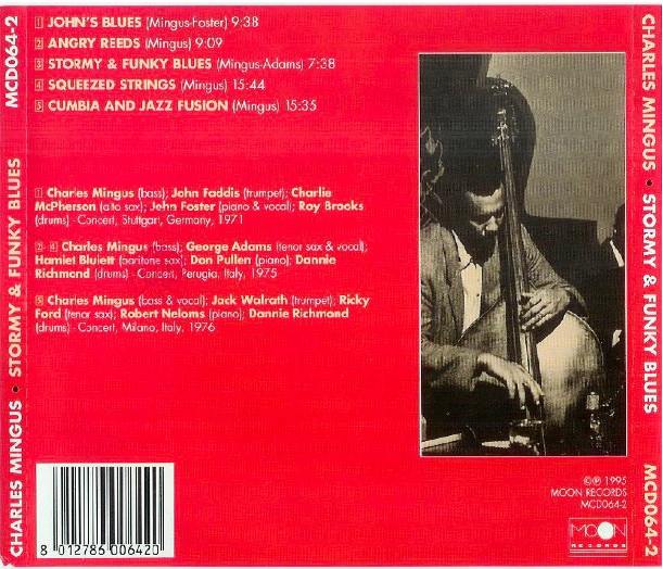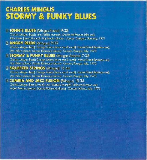 Stormy Funky Blues is a kind of mishmash collection of some late live recordings by three Mingus-led small bands. It’s listed by Sue Mingus, the late composer’s wife, as one of many bootleg albums that the Mingus estate encourages fans not to buy, so the listener may wish to consider this request. Then again, it’s likely the only time that someone (Roy Brooks here) performed a musical saw solo on a Mingus session. The piece called "Angry Reeds" is actually "Flowers for a Lady" from Mingus Moves and composed by George Adams, not Mingus as credited on the disc, but, aside from the shabby labeling, it’s actually a stronger performance than the official version, taken at a faster tempo and featuring a stratospheric tenor solo from Adams. Similarly, "Squeezed Strings" is actually "Opus 3," also from Mingus Moves, but also, arguably, a more inspired reading than the original with baritone saxophonist Hamiet Bluiett is fine form. The title track is the sort of loose blues that the band with Adams and Pullen played regularly, with the former on strangulated vocals not far from his "Devil Woman" on other recordings. Most interesting is the version of "Cumbia and Jazz Fusion," here scaled down to a quintet arrangement without, among other things, the layers of percussion on the authorized recording. This barebones approach gives the composition even more strength and spine and also contains some wonderful solo work by trumpeter Jack Walrath, but just as the piece is warming up, the tape suddenly ends. The sound quality is hit and miss and the audience applause is often irritatingly loud. For fans, it’s a valuable document of late period Mingus, but the buyer will have to make the decision on the appropriateness of purchasing a product whose proceeds will not benefit Mingus’ heirs and family at all. – Brian Olewnick, All Music GuideEnjoy!