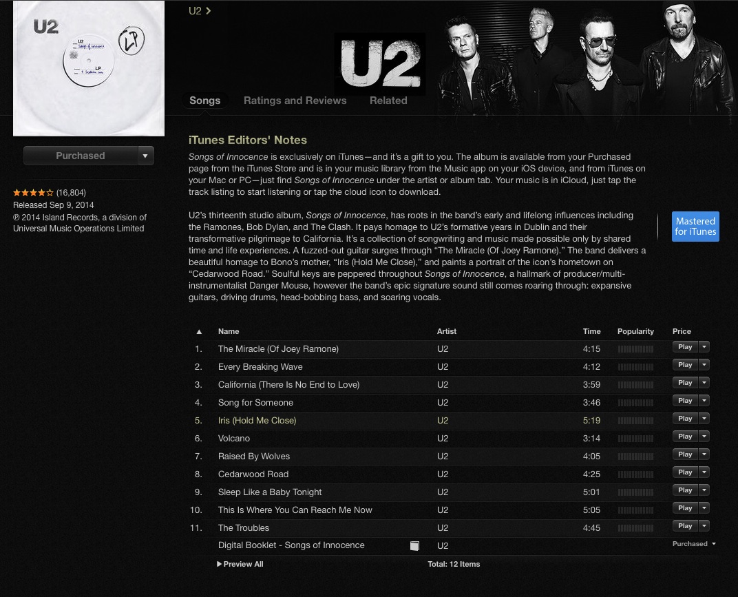U2 have been the biggest rock band in the world next to the Stones for almost as long as I’ve been alive. The fact that Bono, The Edge, Adam Clayton, and Larry Mullen, Jr. still did north of $700 million in business on their last world tour is proof in and of itself that the cult of U2 is still mighty strong. All of which makes their decision to team up with Apple and force-feed their latest record to the world so strange. This was a guerrilla marketing ploy in the most literal sense, but was it necessary? Was U2 really that worried that the whole world wouldn’t eventually find their way to Songs of Innocence on its own without giving fans a forceful shove?