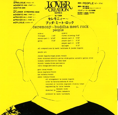 ————-Quite a weird little record — part psychedelia, but with some really rootsy elements — and also some odd use of recorded music as well! The sound here is really mindblowing — experimental and trippy, but never too free or over the top — and the core instrumentation includes lots of fuzzy guitar, organ, and rough percussion — plus additional vocals in parts, and even a bit of sitar as well! The production abstracts some of the sounds nicely, but never too much — and at times a more traditional Japanese style of music lurks in the background, possibly as a brief nod to the Buddha in the title. Most unusually, though, is that the first track on the record features part of a David Axelrod album playing in the background! There’s clearly an Axelrod influence going on — both in the structure and sound of the record — although the group also take things very much in their own direction too. Titles include "Shomyo (part 1)", "Flower Strewing", "Prologue", and "Prayer (parts 1 & 2)".