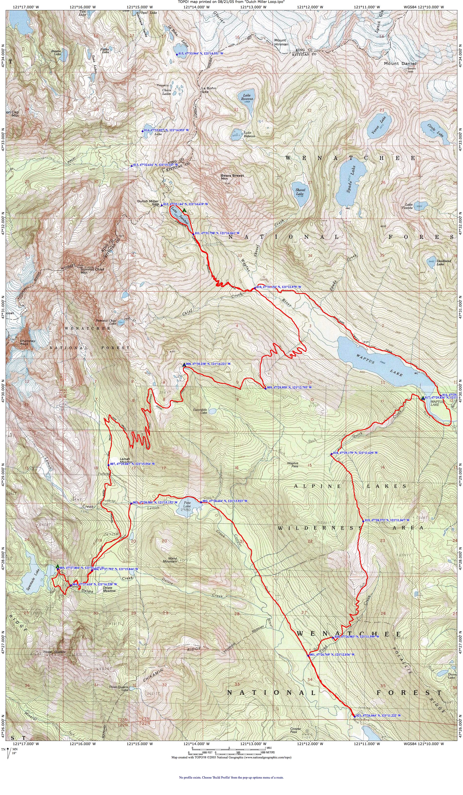 Here’s a link to the TOPO! route of the planned trip (showing us coming out up Quick Creek and down Tired Creek instead of our actual route down the Waptus River and up the Cooper River.)