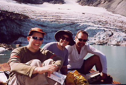 The next morning we hiked down to Lyman Lake. Jo tripped over a root and fell just before crossing the outlet stream so we paused while she washed up. We hiked up the official trail to the upper lake while it meandered through alp land and over moraines. Absolutely gorgeous country! Art kept seeing places that he thought were where he had camped. We hiked all the way to the snout of the glacier where we parked ourselves on big rocks. We read. We played with icebergs. We threw snowballs. We touched the calving face of the ice (and heard rocks go whizzing by.) Arthur and Jo (and even Will) built rock towers. I walked way down to the first rapids and back. We watched a group of four backpackers pick their way down from Spider Gap. In the middle of the afternoon we hiked out, staying next to the water. Will found his own way on the other side of the lake from the rest of us. Odette worried until we were reunited. We took the alternate way down, doing a little boulder hopping and then following switchbacks at the edge of the heather. We hiked out next to the lake, stopping on the main trail to talk to the resident ranger.