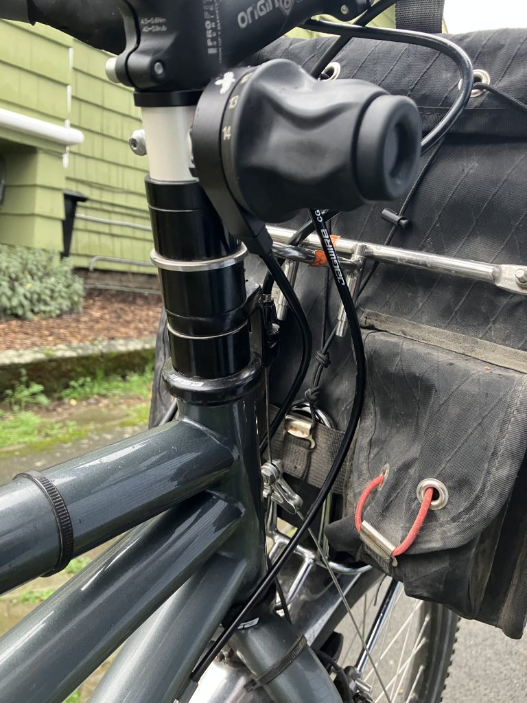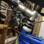 I raised the front bars up to the top of the steerer tube and I’ll figure out where I want them before cutting housing or cable or the steerer. I figured out that what determined the length of the housing was the position of the hanger, meaning that if I left the hanger the same distance below the clamp I wouldn’t have to add any housing. I end up with a hanger that is really too high and a long exposed cable segment, but it will work for now. The first time I have it serviced I’ll need to cut the tube or add some housing to the front brake cable.