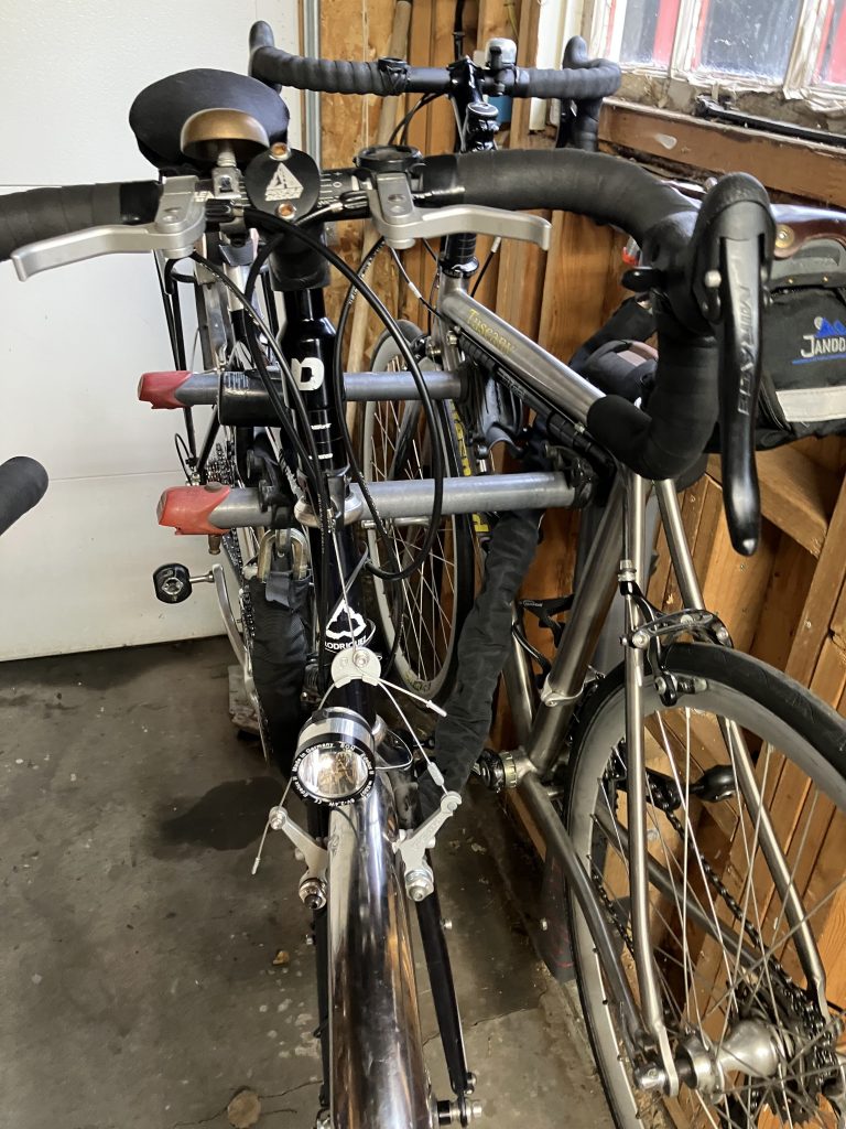 I spent the afternoon cleaning and organizing the garage. and really didn’t make a dent. I found some more Rohloff parts – including a shifter. I discovered that I have a lot of old cantis. I found some smaller outriggers and I may try to combine one of those with a light stub. I didn’t find a side-loading mini pump bracket. I wasn’t able to rotate the right hand shift lever on the Centurion, but it still works despite the crash and actually may not have been twisted at all. I still need to swap out the front derailleur on my Litespeed for the one from the Taliani and clean the three bikes with fenders.