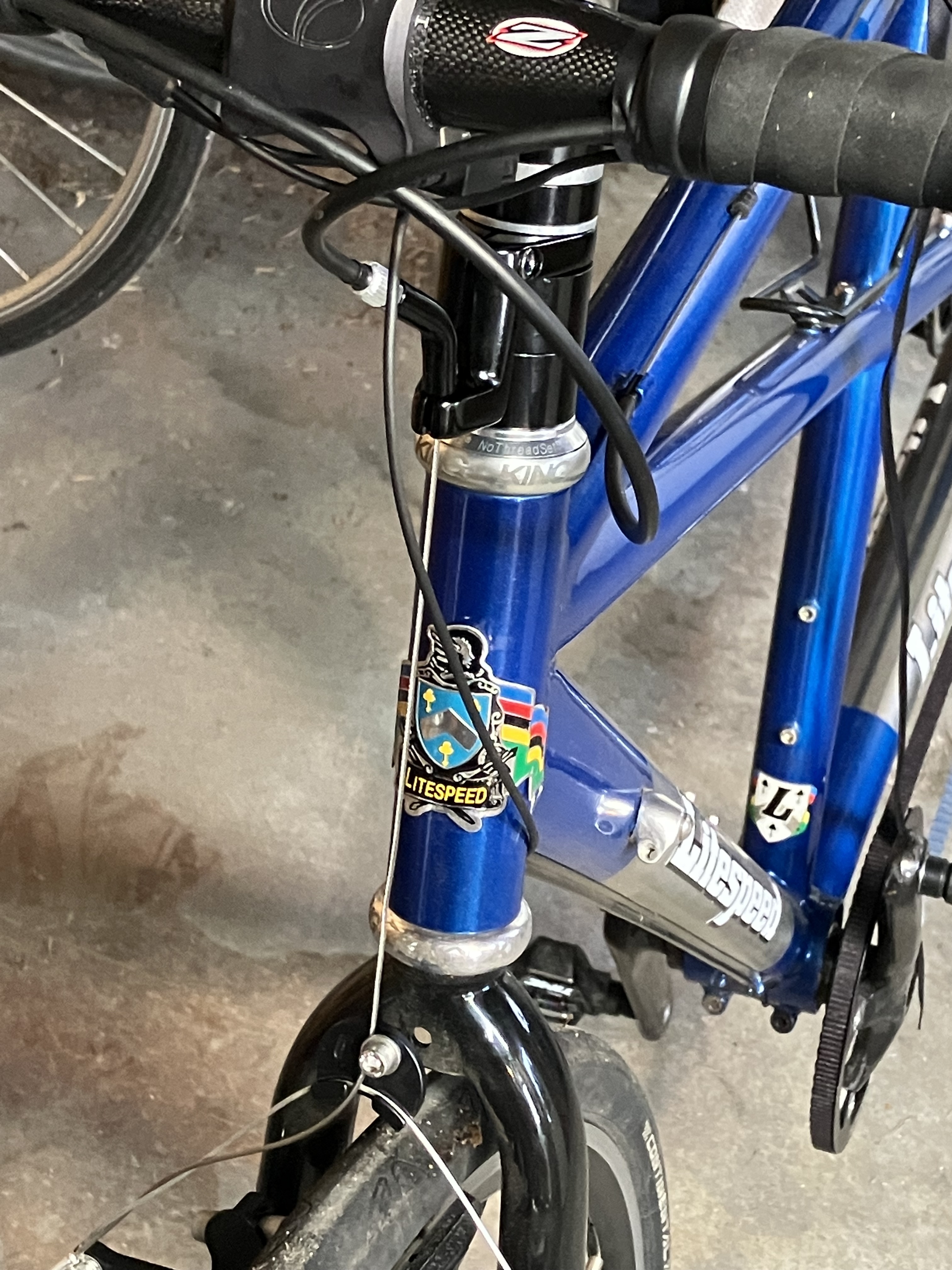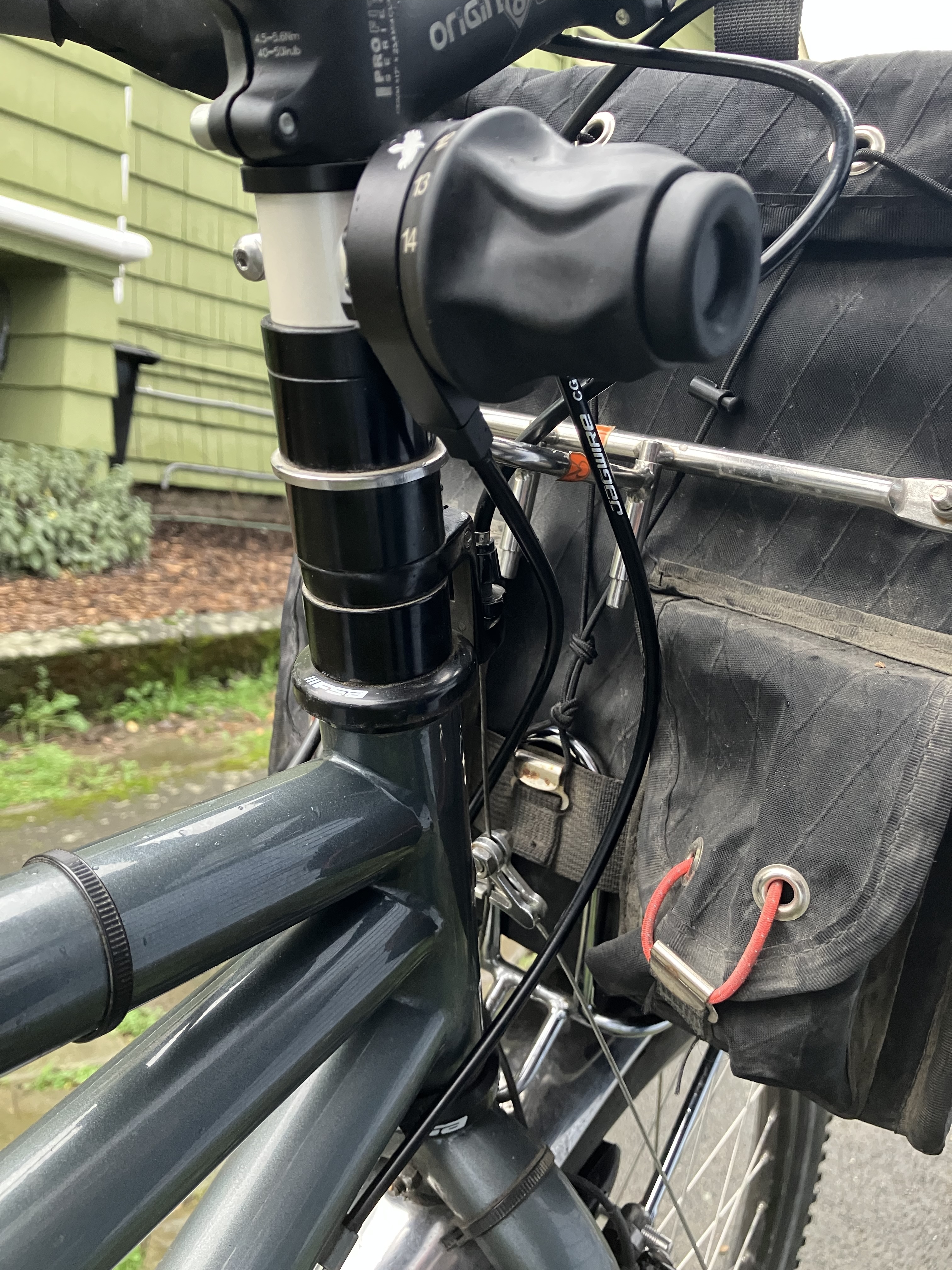 - I’m not sure what to do about the steerer tube – I either want to raise the bars or cut off the excess tube because the stump on top of the bars isn’t a good look. First, it appears that putting the stem at the top of the stack would be about the same height as the red tandem; as they came from the shop they are about the same height as the litespeed classic. Second, it appears that only the front brake is going to be an issue (i.e. it looks like there is enough slack in the rear housing.) There is likely enough extra inner cable on the front brake so that I wouldn’t need to replace the cable, and with a double-ended ferule I ought to be able to add three or four inches of housing without unwrapping the bars. (I would still have to undo the brake and reset them afterwards.) I’ll probably live with it for a while and maybe wait for the first tuneup to fix the steerer.