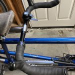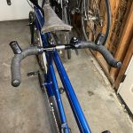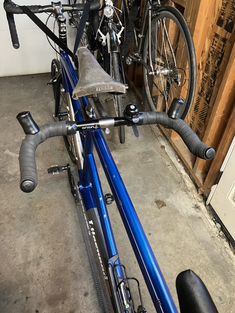 I got a pair of Origin8 bullhorns and got Odette’s buy-in to try them on the blue tandem. The weather turned wet and we weren’t going to be riding any time soon so there was no hurry to install them. The bar tape came off the Prima bars intact, so I wrapped the bullhorns with the old tape just to have something to hang onto while we adjusted their position, figuring that I’d save the new tape until I was sure the bars were going to work. The bullhorns were the occasion for a conversation about saddles – I read Peter White’s comments to her and we talked about cut-outs and shapes. Here are the links I gave to her: