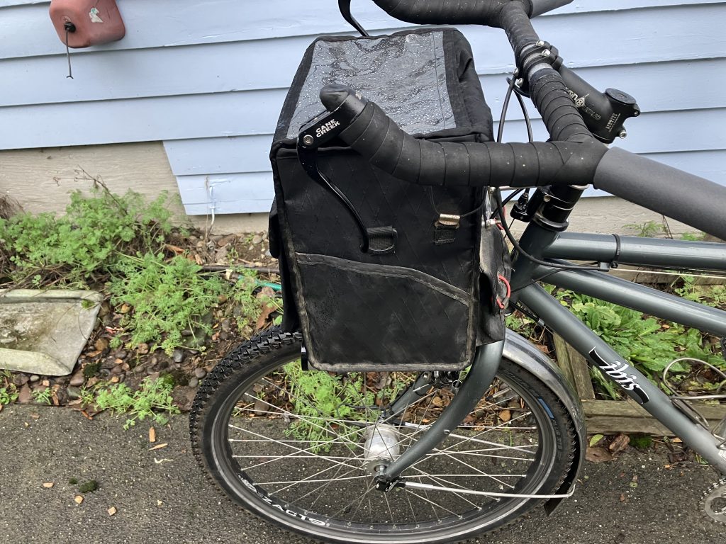 While waiting to go on my ride on the red tandem on Wednesday I took the crazy bars and held them up against the rando bag I use on the Ibis. They looked like they were made for each other and I knew I’d made my choice. When i got back from the ride I removed the bar tape and bar-end shifters from the crazy bars. (I dropped one of the bar-ends and didn’t get it back together right but it’s just going to sit in the parts bin for a while anyway.) I had to change stems because the one on the bike wouldn’t clamp down tight enough for the crazy bars. They are from the same manufacturer (Profile Design – the one from the crazy bars has a longer reach) and they’re supposed to have the same clamp dimensions, but only one of them works. The straddle cable attached to the bars was for a narrow 700C wheel while the Ibis has a wide 26-inch wheel. I had to replace the straddle cable to hook up the front brake, otherwise that cable was ready to go. The crazy bars were set up for a single bike and the cable for the rear brake wasn’t long enough. I had trouble getting the stopper out of the reverse lever and had to remove the pivot screw and take the lever out to remove that cable. The new one went in just fine and after some fiddling with the cable splitter I decided that it was good enough. I replaced the stripped fender screw and tried (without success) to manually shift the Rohloff into a higher gear. In order to make sure the cables got split I wanted to attach both pieces of the cable splitter to both cables – but they split in different places so I had one long and one short cable under the keel tube. I put a short cable end into the shorter splitter and then matched it with a very short cable end in the longer cable. I wrapped a piece of velcro around the tube to hold both cables in place.)