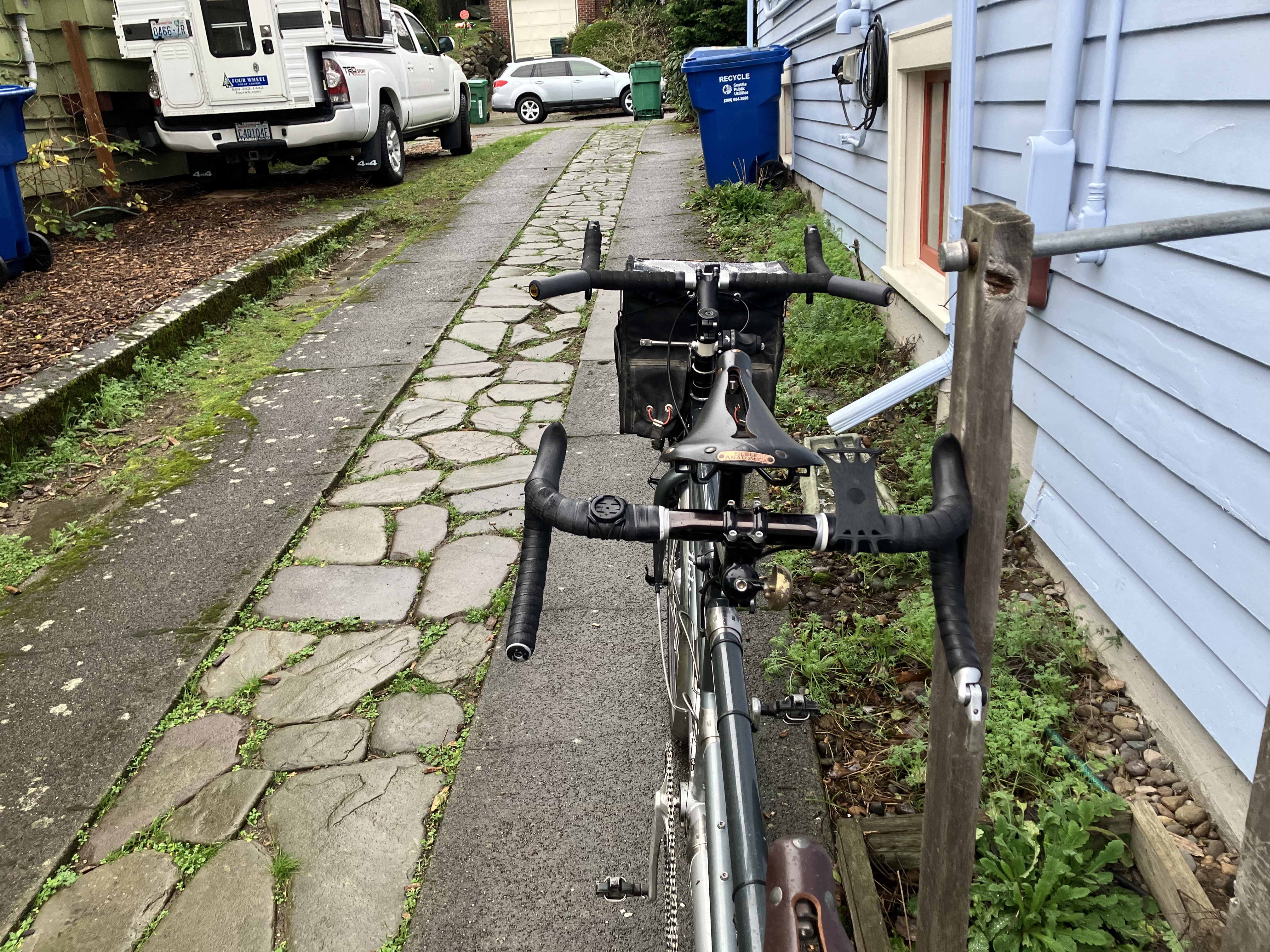 The 15th of December was a Monday and R+E wasn’t open, so I planned to call that Tuesday, figuring that after a month I’d waited long enough that it didn’t look antsy and that I ought to check in to see if they could tell me when the bike would be done. After a wet ride I was scanning email when the phone rang and it was R+E saying that the Ibis was ready for me to pick up. Odette gave me a ride over and I rode home in almost dry conditions. The bike shifts really well. It has always been geared too low and that is even more noticeable now, but with Odette on the back it likely won’t feel as light. Its started to rain as I pulled into the driveway but I decided to take some photos anyway.