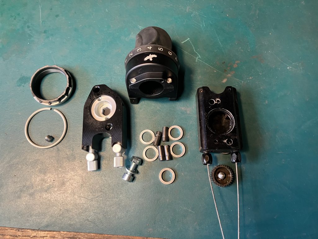 The fall shaped up to be pretty uneventful, a trip to Long Beach (memorable mainly for squirrel bridges) being the only excitement. I went out to the garage on a Monday after lunch to put fenders on the Ibis. Odette likes to ride on Tuesdays and the forecast was wet. The fenders went on easily but at some point the bike fell over and although I caught it and it didn’t hit the floor, it did make contact with the stand. I finished the installation (stripping out the socket on the head of one screw on the front fork) and went for a ride around the block to prove that there were no rubs. And… the bike wouldn’t shift up. I kept trying and it “gave” – the shifter moved further than it should and then had no resistance at all. I got back to the garage and removed the hood – the cable was broken and the lever was no longer ratcheting.