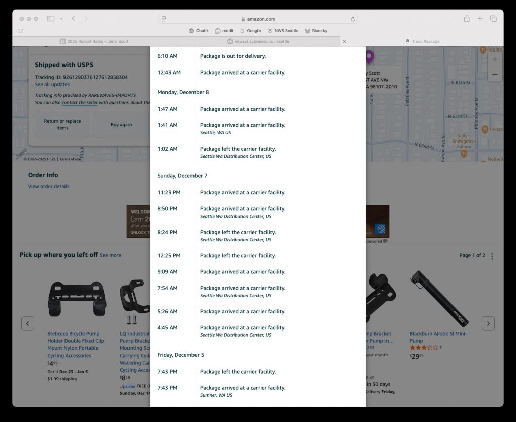 The little mini pump bracket I ordered back in mid-November finally arrived – two weeks early. The real story is that I didn’t realize it was actually coming from the UK, but I wouldn’t have had to wait so long if it hadn’t gone in and out of the Seattle distribution center so many times.