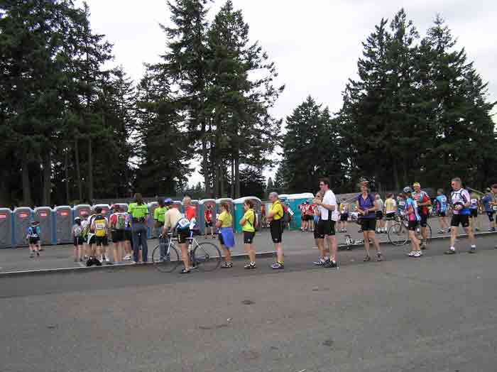The ride through Auburn and Sumner was quick and we picked up a low-numbered guy on a tandem who liked our pace. He had a pre-teen girl for a stoker. We skipped the ministop in Puyallup and climbed “The Hill” with no trouble, albeit in the lowest chainring. We stopped at the Spannaway stop for fruit and vitamin water and took pictures of the lines for the portapotties.