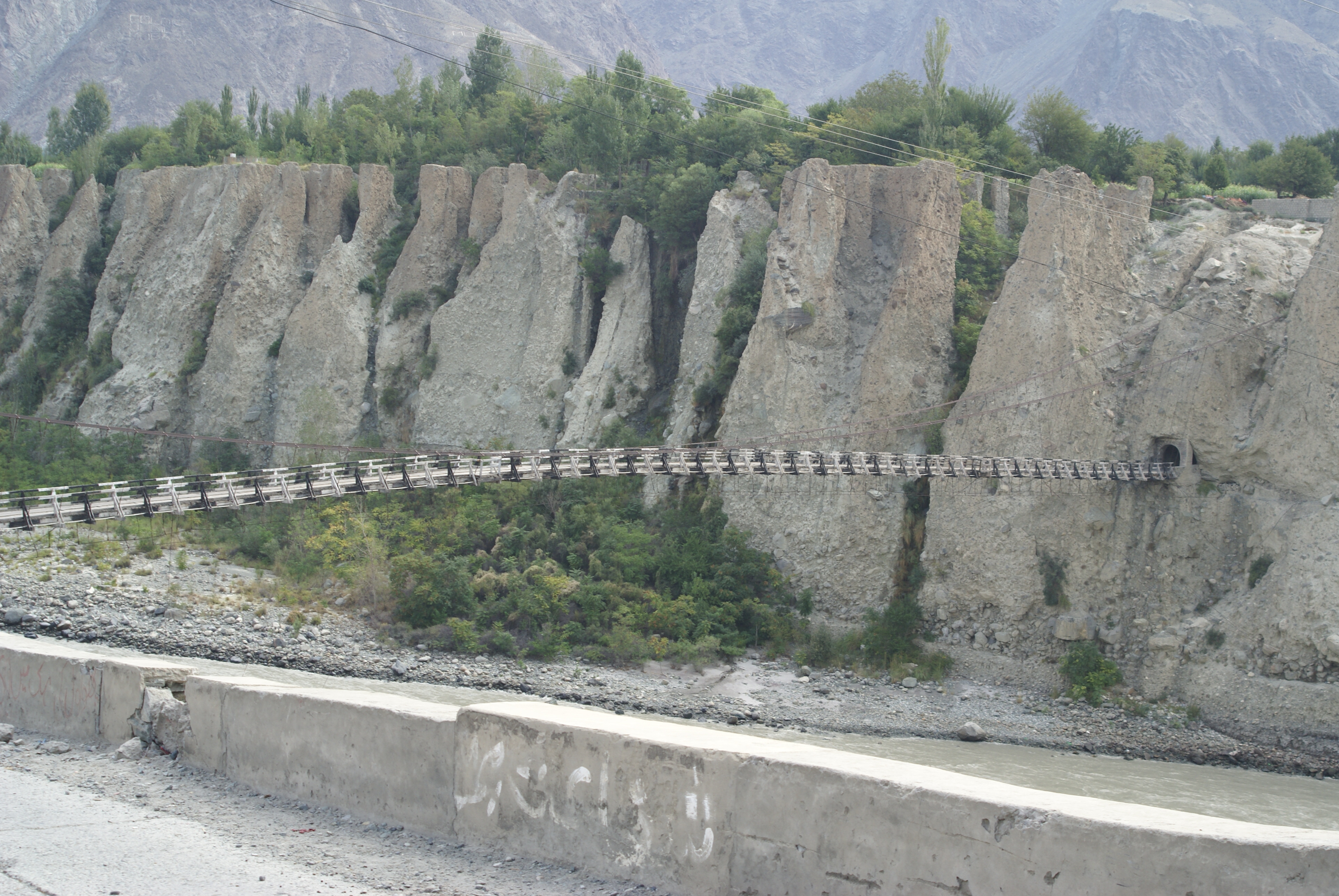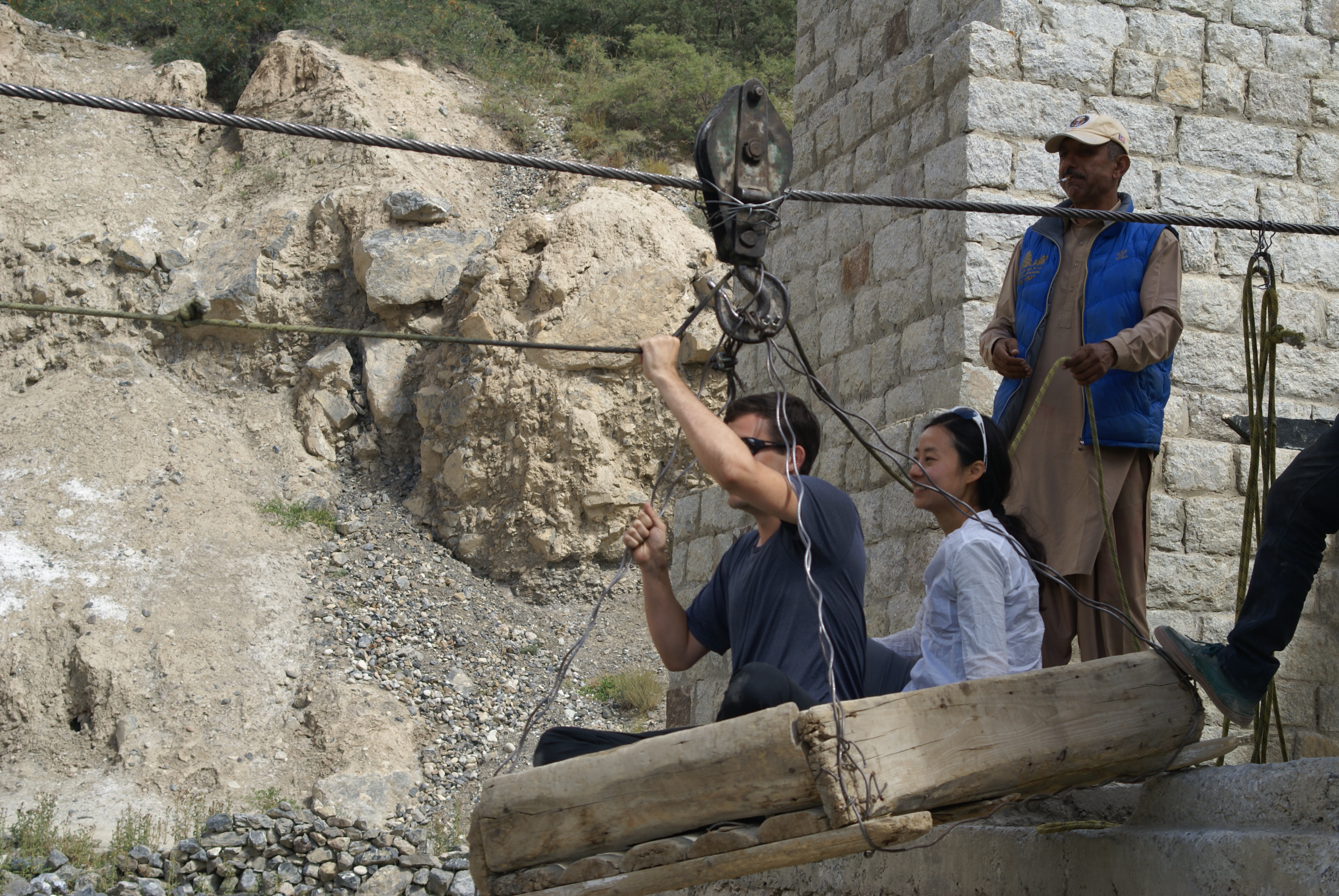 We caught up with Mako in the dark just before Dih. There weren’t any beds there by then so we headed back to Sost in the van. We had dinner in the hotel restaurant proceeded by the bottle of brandy to celebrate the climb. We agreed that we’d head up the Chapursan valley to Zoodkhun the next day, planning to get driven out to the village, spend the night, and bike back the next day. In the morning Mansoor went to the police to get a permit and it emerged that 1) we couldn’t get a permit but they gave him a phone number to call if anyone challenged us, and 2) they weren’t going to authorize anything more than a day-trip by van. So we set out in the van up a rugged dirt road carved out of the sides of a canyon. After getting through a set of cliffs the valley opened up and looked pretty prosperous. We stopped at the site of a bridge construction project and tried out the temporary cable car crossing. At the upper end of the valley there is a Sufi shrine about 10 km from the Afghan border, but a police checkpoint gets in the way of approaching the shrine. We stopped and talked to villagers and Mansoor identified one of them as a relative so we had to go to his house for tea. We had packed food for an overnight so we went in for tea carrying chapattis and canned curry and we had that along with the tea. The house looked like it was derived from a yurt – mud brick walls, carpeted platforms, a hole in the center of the ceiling. There was a granddaughter who spoke english and who had very fair skin. We gifted them a watermelon and drove back down in gathering darkness and saw a fox crossing the road.