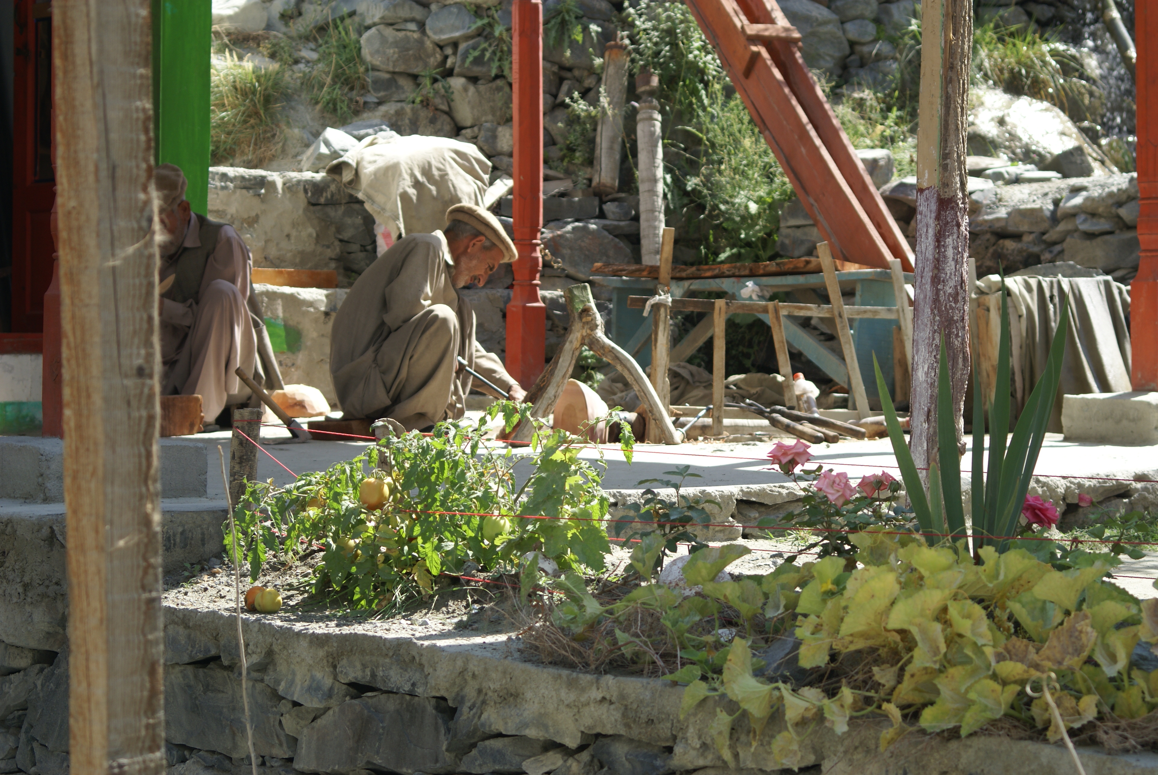 The next day, since we were killing time, we biked back to Gulmit with a stop at the Glacier View cafe for another apricot cake. We got there early enough for Mako & Mika to walk the loop to Ghulkin. The following day Will and I biked to Passu and across the suspension bridge to the start of the road to Shimshall. Mako and Mika walked to Hussaini and did the suspension bridge loop there. Will and I climbed to the Andra fort and I washed bikes in the afternoon. That evening Zahir gifted us with a bottle of local wine – or something – it tasted as if it had been distilled but we were never clear what the fruit was or how it had been produced. Mansoor stopped by but he had been drinking something much stronger.