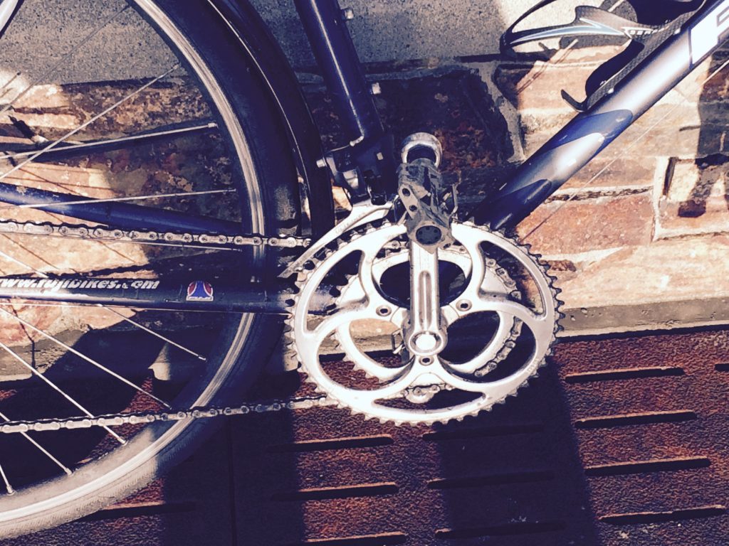 I hadn’t really committed to this project (or to spending a bunch of money on a 15-year old Fuji) when I read an article about the Rene Herse cranks sold by Compass Bicycles. I have a fondness for Compass because of the prose Jan Heine writes about rides terminating in North Seattle, and I share his opinion of “protected” bike lanes. I was struck by the design of the Rene Herse chain rings and decided that they would really look good on the Ibis. It seemed to me that eventually I was going to want to replace the Ibis drivetrain (which I’d left intact when I rebuilt that bike) with a 10-speed set up, and the Rene Herse cranks would really add a kind of elegance to that conversion. I liked the idea that I could do the conversion on the Fuji as a trial run and figure out what I liked and what I didn’t – before I committed to doing it on the Ibis. (I buy the idea that three bolts are adequate and it’s a cool way to get a smaller BCD so that you can go with smaller chainrings and a single set of chain ring bolts.)