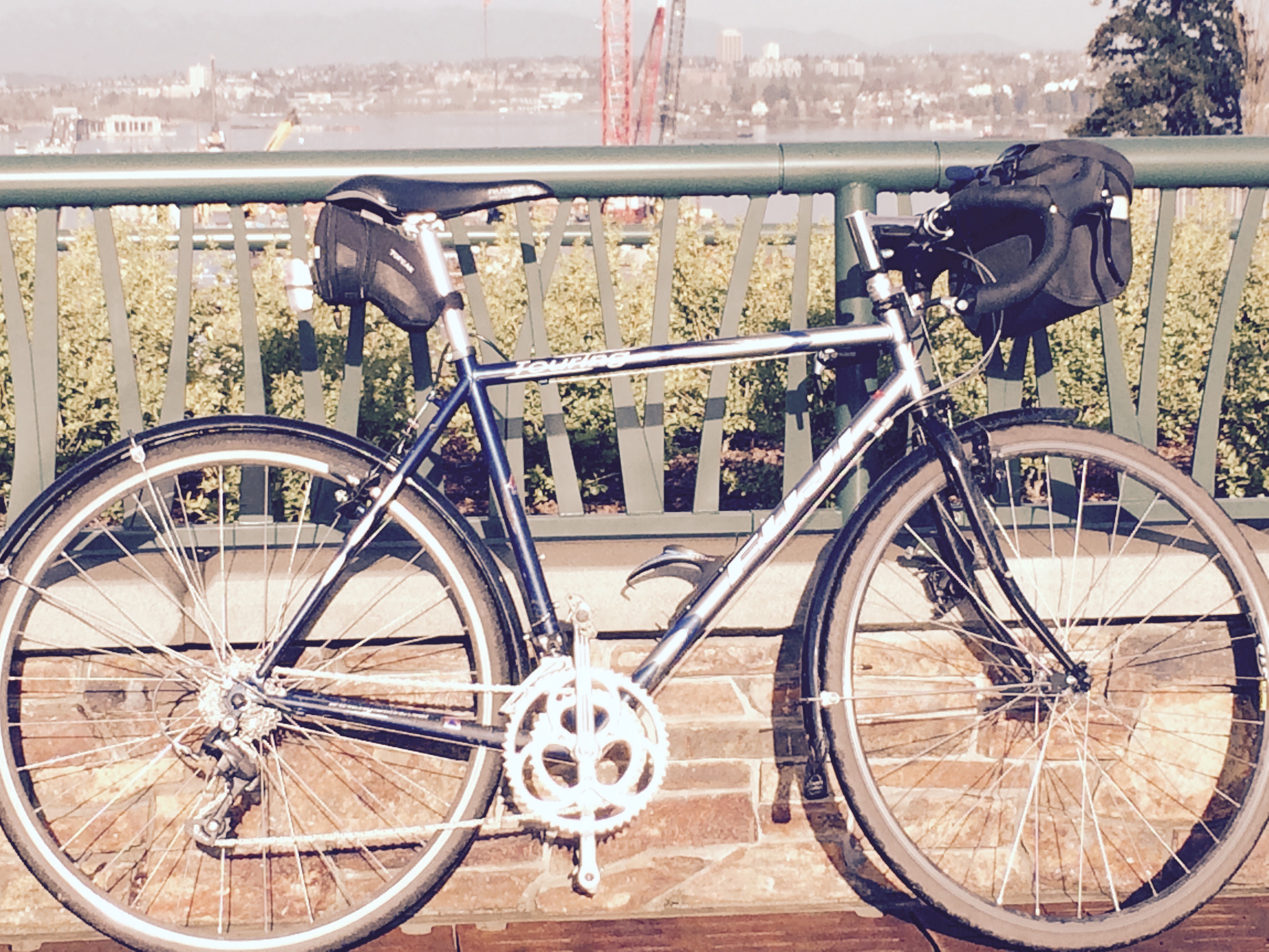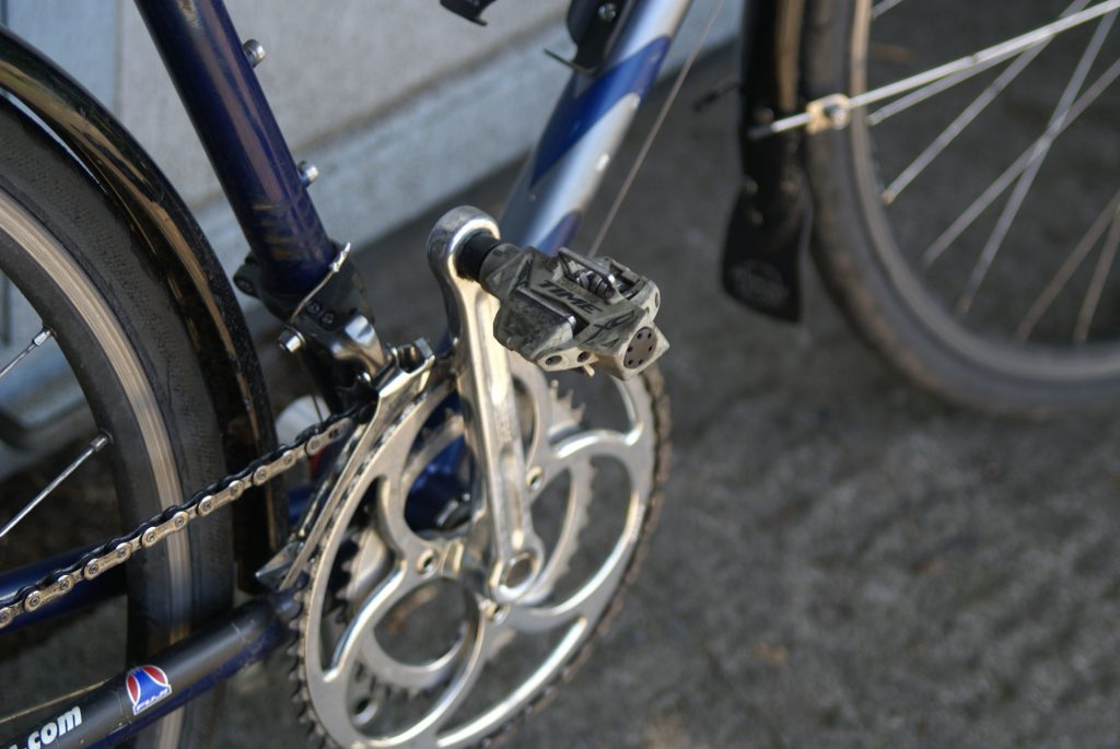 I took a short ride (10 miles up to Shoreline) and found that the handlebars wanted to rotate and that the rear shifting wasn’t right. I tightened the bars (by feel) and fiddled with the cable tension but just succeeded in making it shift less well. I put bolts in all of the open braze-ons and took the bike to Recycled Cycles for an inspection and consult. They supplied a length of 1 1/8″ steerer tube to fill the void in the stem. They replaced the 1″ spacer with a set-screw type nut and a couple of thin spacers. They fiddled with the brakes until they felt they were good. They straightened the derailleur hanger and adjusted the indexing until they felt it shifted pretty well – although they still noted some issues with the smallest cogs. They tightened the crank bolts but said everything else was fine. They were impressed that I got the stem onto the bars with no scratches. I bought a set of full fenders and when I got home I installed them and a bracket for a handlebar bag. (The home-made cable supporting the bracket was too long so I had to cut off one end, which meant going to TrueValue to buy another screw-terminal.) The guys at Recycled Cycles had evidently loosened the bars because the drops were rotated forward; I opened it up and rotated them back again without resorting to the torque wrench. I mounted a mid-fork headlight mount. I mounted a carbon bottle cage that I bought for Will’s bike and which he didn’t want. I replaced the original 15-year old Time Atac pedals (that got scorn from the guy at Greggs) with a set of the X-Country model – XC6 – I bought in 2014 (had to match the saddle.)