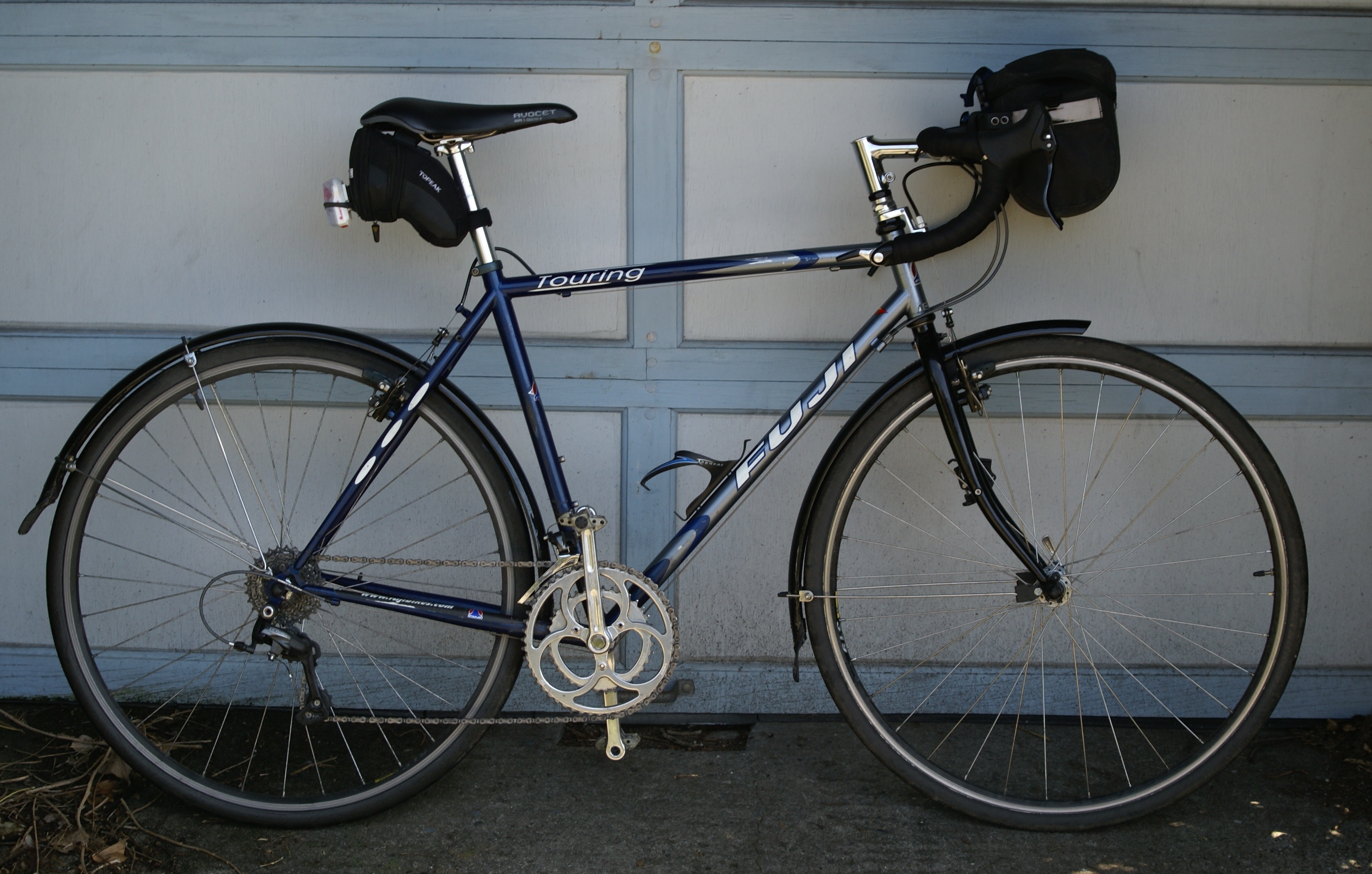 My main ride for a lot of years was a 54 cm Fuji Touring that I bought new from Recycled Cycles in late 2000. It had a steel frame and a Tiagra groupset – Deore RD and Tiagra FD (with 52-42-30 in the front and a 9-speed 11-32 cassette) Tiagra hubs and Avid brakes with Tiagra brifters. The BikePedia entry says that it should have had Sora components but the 2001 entry matches my bike pretty well except for the headset: (The frame geometry matches the 2000 image but the colors are 2001. The hubs say Tiagra, though, and have 32 holes, while both years’ entries would have you expect Sora with 36 holes.)