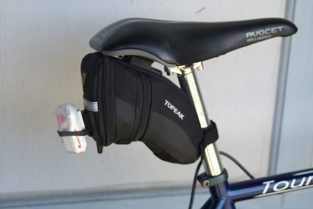 The original Fuji saddle had worn out long ago and I was riding on a Burley saddle salvaged from our original tandem. When I installed the R+E brakes I decided to raise the saddle so that it felt the same as my other bikes, and re-discovered that it was already at the maximum line on the seat post. I got a 400mm Origin8 seat post from Amazon and when I was at Recycled Cycles a few days later I bought a $15 used Avocet saddle. It was a funny “X-Country” shape with a broad kind of shelf in the back to facilitate sliding on and off the saddle during mountain bike races, but I like Avocet and the price was right. I rode it quite a bit and put a lot of energy into the fore/aft and up/down adjustments as I tried to get it dialed in properly. It’s overkill inasmuch as I’m not going to use the carbon shell to steer the bike on technical downhills and I could probably get along without titanium rails, but I told myself that the shelf in the back would keep my wedge bag from getting rained on.