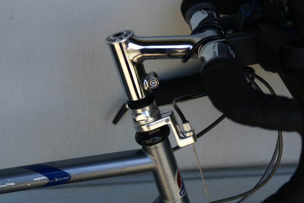 They had a similar steel fork and extended the threads down lower on the steerer tube so that it would fit the Fuji. (I was under the impression that I could stick a 1 1/8 fork in a 1 inch head-tube just by changing the bearing races. They showed me that I was wrong on that and made me realize that the Ibis rebuild – where I had gone from threaded to threadless – was 1 1/8 to start with.) Given that I couldn’t use a 1 1/8 inch fork, and given that I had gone to some length to get a 1 1/8 inch stem, I was committed to a quill adapter – and the one I had left over from the Ibis project had a 1 1/8 inch quill.
