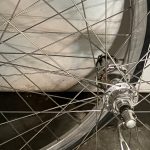I got a call from Recycled Cycles when the wheels were done and stopped by the store on my way home from a ride. I slung the wheels around my shoulders with a runner and rode home with them on my back (I started out with a vertical arrangement but the upper wheel banged into my helmet and I couldn’t tilt my head back to see up the hill – I stopped and reconfigured it on the horizontal so that I was too wide for the bike lane but considerably more comfortable.) Once again, I got the wheels back into the garage without Odette noticing.