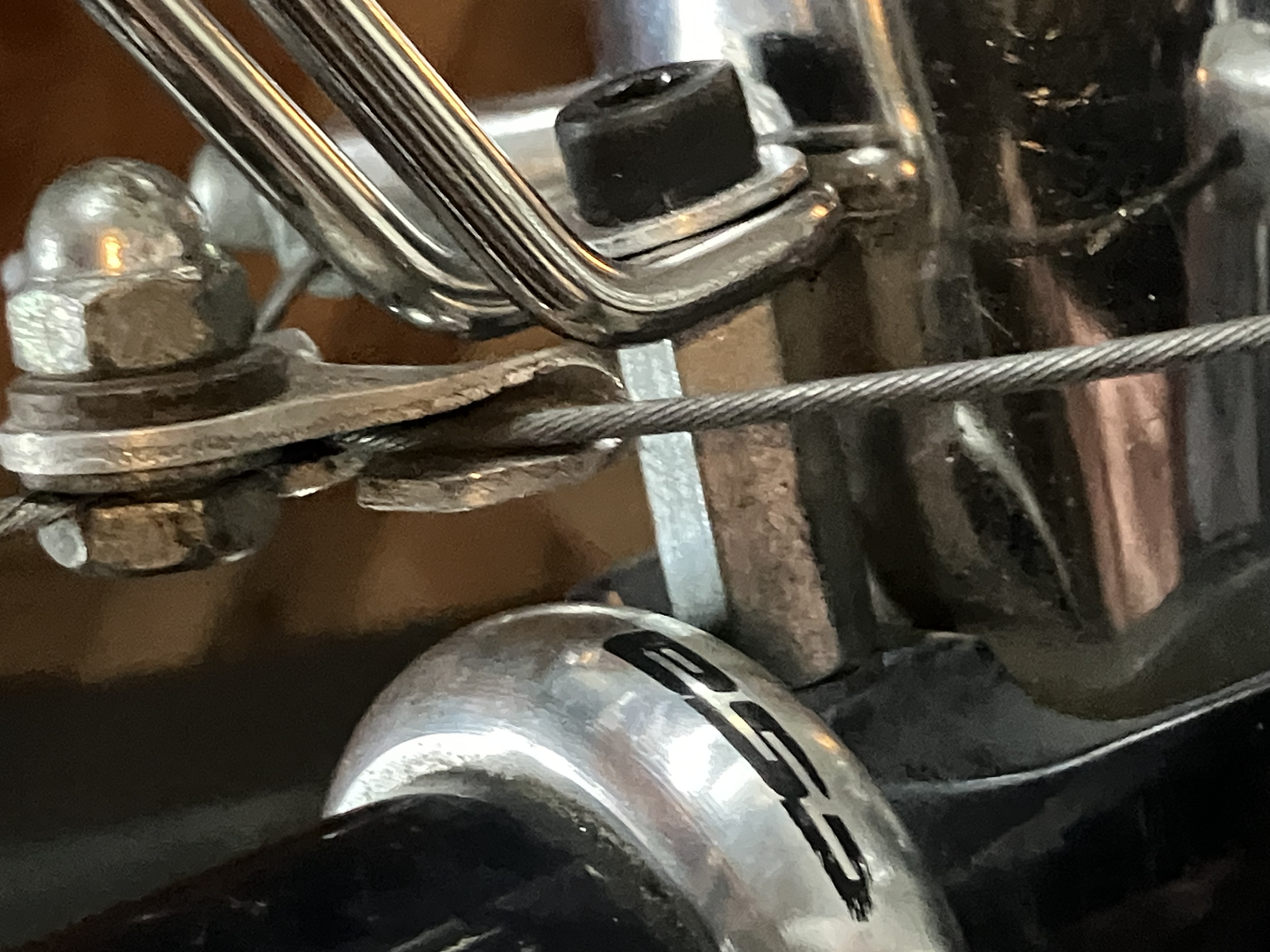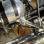 The headlight was a little tricker. I removed the bolt through the fork crown and found that it was an M6, maybe 40mm long. It supported the front fender with an eye-bolt inside the fork which meant you had to loosen a rusty nut inside the fender to get the crown bolt out. I didn’t have anything longer and I could see that I needed a couple of spacers to keep the mount away from the bearing race. I fiddled with it for a couple of days, considering buying a longer bolt or a recessed nut but I finally found a piece of hex stock with a threaded 6mm hole. I flipped the bolt so that the head was in the back of the fork and tightened it down with the hex extender serving as a nut on the front. (I probably should have put a lock washer in the stack but it’s not structural so if it loosens I’ll just tighten it back up.) I screwed a shorter M6 bolt into the other end of the hex piece to catch the headlight mount. This set up positioned the mount out in front of the cantilever yoke, barely cleared the fender, and it certainly seemed substantial enough to hold a headlight. I thought it was pretty elegant and was pleased that I had been able to improvise a solution with parts on hand. (I still don’t know where that piece of hex stock came from or what it was originally for – it had a barrel adjuster screwed into each end but I don’t think that was really functional.)