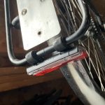 While waiting for the wheels to be built, I mounted the tail light on the rear rack. I’m not sure where it came from, but I had a bracket with a 50mm pair of holes on one end and a single hole on the other. In the end I was concerned that it would rattle and instead went with two small P-clamps, padded with strips of rubber, like I had done on the Ibis.