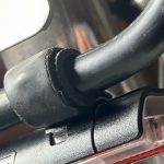 While waiting for the deliveries, I went ahead and mounted the headlight and the new front wheel and it worked like a charm when I plugged it in. I ran the wire between the headlight and tail light and found that there was more than enough wire for a small frame. I undid the plate on the rack and pushed the wire near to the center, then tightened it up again but not so tight as to crimp the wire. I wrapped the wire around the rack strut, around the brake cable and still had enough left to wrap it around the head tube a couple of times. This version of the tail light wire had a ring terminal with a male spade connector that I could put under the nut on the headlight mount for a ground. This made the connection much simpler than the ones I’d done before since it meant not having to crimp any connectors onto the wires. When I got both conductors plugged in I spun the wheel and both lights lit up which made me happy. I’ll have to go for a ride with Odette to observe the brake light pulses. I probably still need to point the headlight a little lower, but getting the lights mounted turned to be much easier than expected.