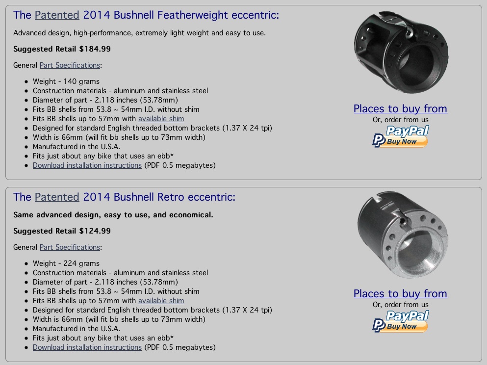 - bottom brackets / eccentric – I’ve decided I want to upgrade to the Bushnell eccentric and I think I want to go with Phil BBs (I arranged with John to upgrade to the featherweight Bushnell – didn’t talk through BB options.)