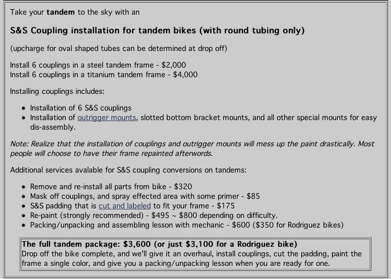 – I’ve probably got $1,500 in the Ibis now. The list of things I’d like to do might add another $1,500 and I’m good with that. One concern is the report that some older Ibis frames don’t have vent holes and thus a lot of internal rust. If the frame is compromised I’d rather not put so much money into it. I’m thinking that one way to find out would be to cut the frame up and look inside – kind of what you’d have to do to install S&S couplers. I’d have to spend some time researching, but I expect that it would take six couplers and probably cost another $3,500 (assuming a repaint at the same time.) If I amortize this cost over 10 years it would be acceptable and then I’d have two travel bikes to choose between…