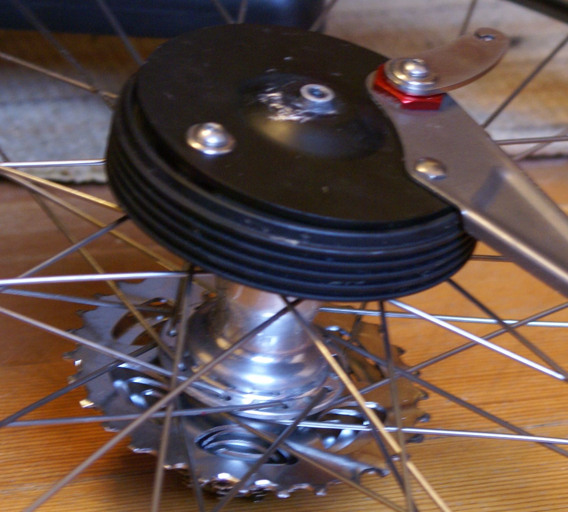 Note – after all was said and done I took the bike into R&E with the Hugi wheel set mounted and asked them to do something involving the rear wheel. They found my spacers and realized that to mount a brake on that hub a third segment of the axle was required (omitted on my wheel set since it came without a drum brake.) With the right axle configuration no spacer was required… They graciously fabricated the missing segment for me and didn’t give me a hard time for my hack.