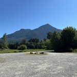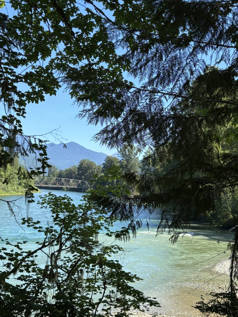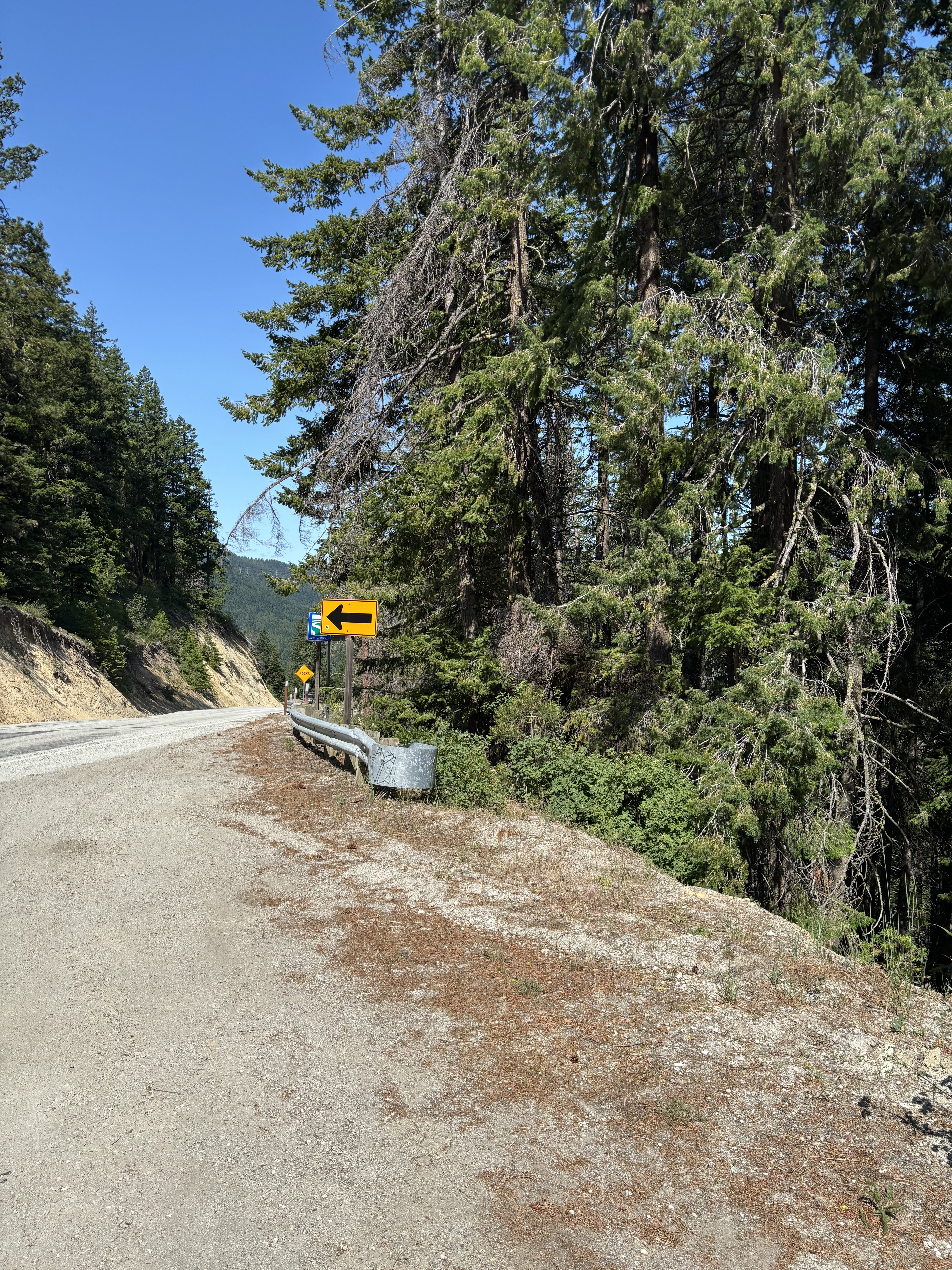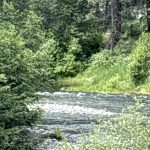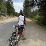 After a final late breakfast at Sun Mountain we checked out (where they surprised us with a resort charge) and drove to Twisp. We parked at the city park where we had parked the last time we opted for an easier ride. We did an out and back on the Twisp River Rd., turning around at the 15 mile point . Here’s the map. The forest was dense (but an east-side pine forest instead of the rainforest we usually ride in.) We saw several deer. There was a Cascade Bike Club gravel bike event that we encountered on the way out. It was much cooler than the two previous days and I wondered if we couldn’t have ridden Grand Coulee successfully – and felt some regret in that I’m unlikely to ever ride that agin now.
